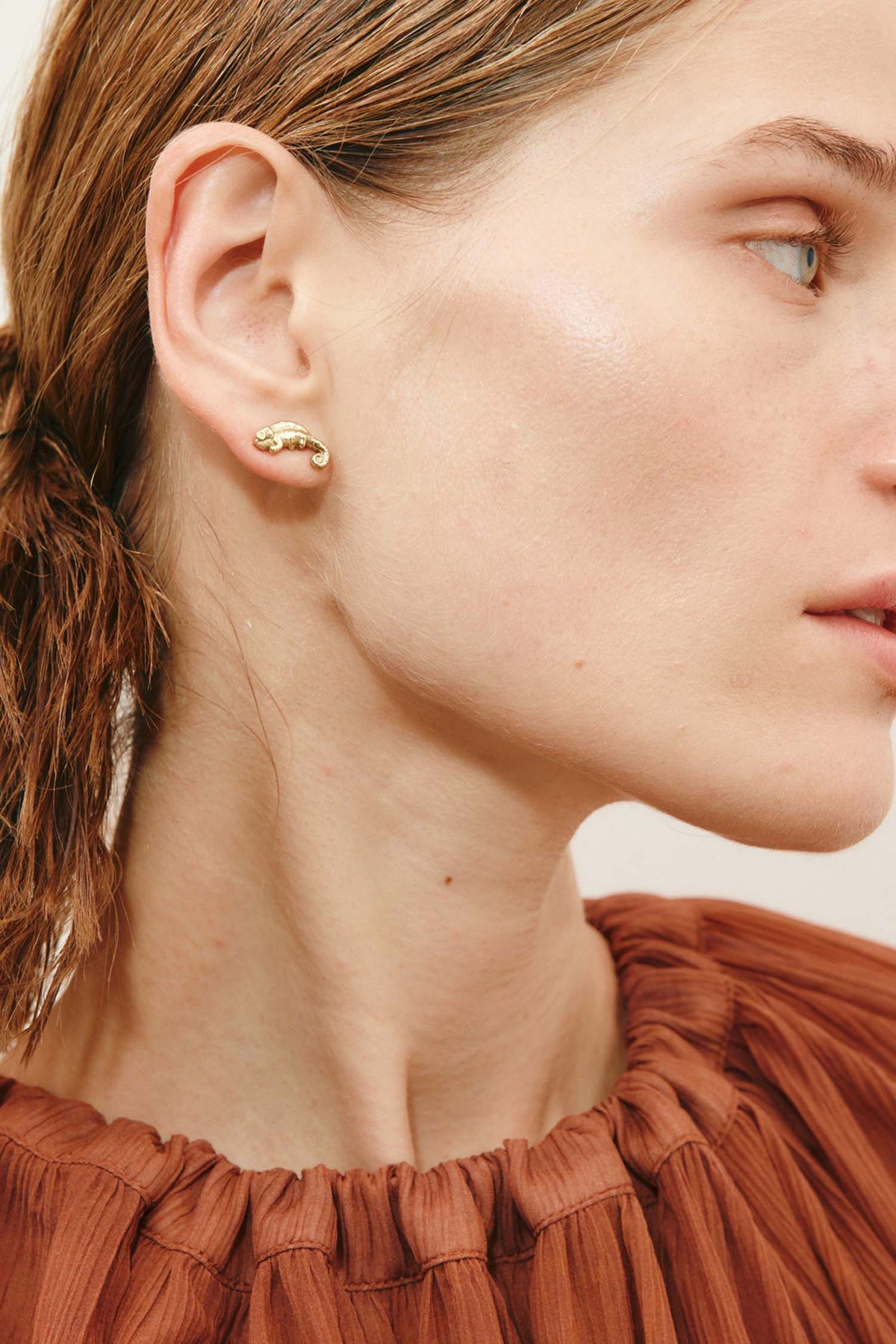 The Jem Chameleon Stud from Alémais reimagines the Chameleon in a playful yet glorious stud silhouette. Cast from nano-plated brass, this pair features a hand-crafted chameleon design that nods to artisan craft. Style yours with sun-kissed skin and swept- back hair to spotlight their charm.