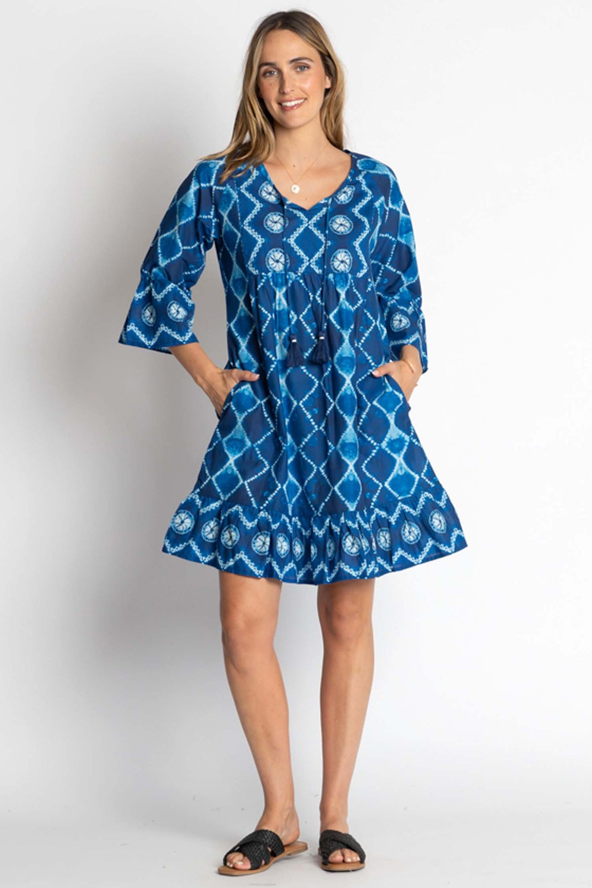 The Kumo Dress in Ocean from LulaLife combines relaxed comfort with effortless style. Crafted from 100% cotton in a striking shibori print, this dress features a neat Nehru collar with a flattering V-neckline and delicate vertical tucks on the bodice that create a softly structured shape. The above-elbow sleeves and curved hem add to its easy, feminine appeal, while side pockets provide everyday practicality.
