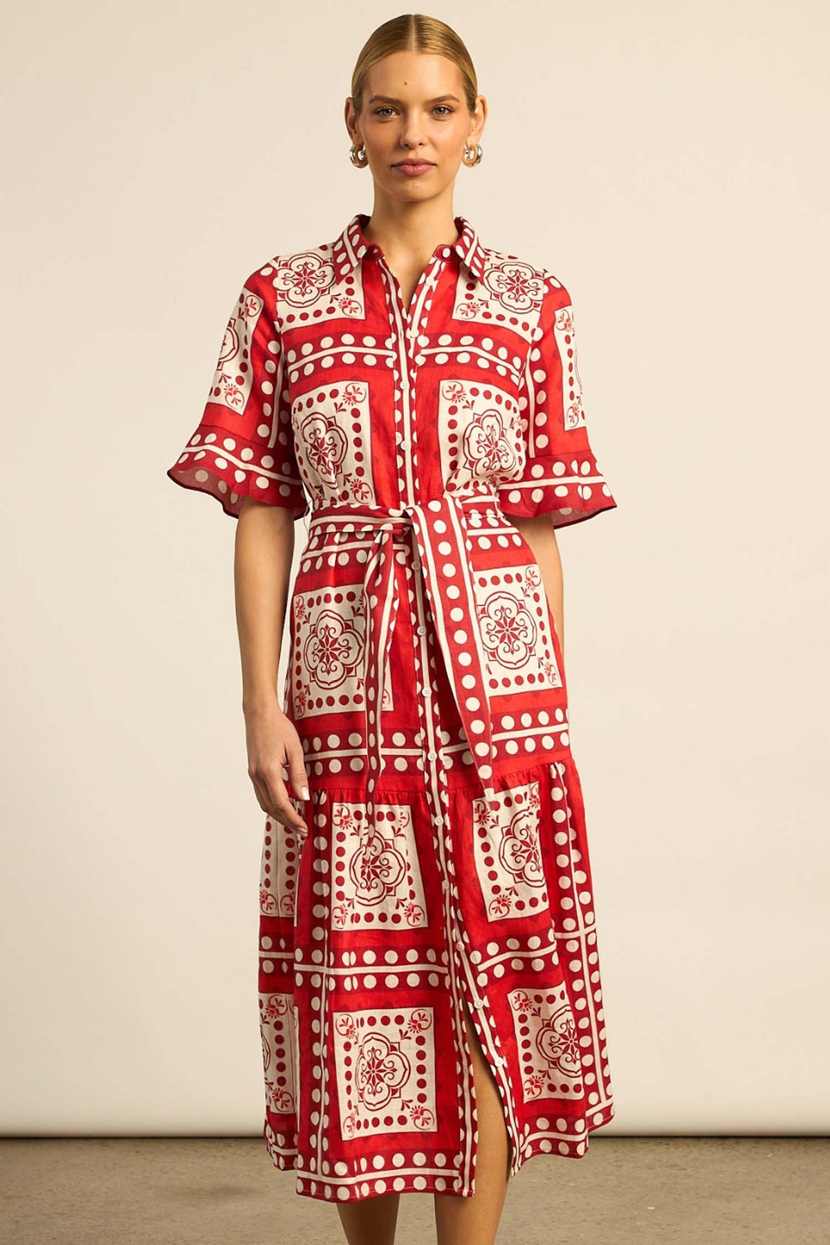 Zoe Kratzmann’s Oasis Dress in Poppy Scarf brings vibrant charm to everyday dressing, rendered in a striking ‘Poppy Scarf ‘print that blends retro motifs with contemporary polish. Made from pure, breathable linen, the silhouette features a sharp shirt collar, fluted short sleeves, and a tiered midi skirt that moves with soft volume.