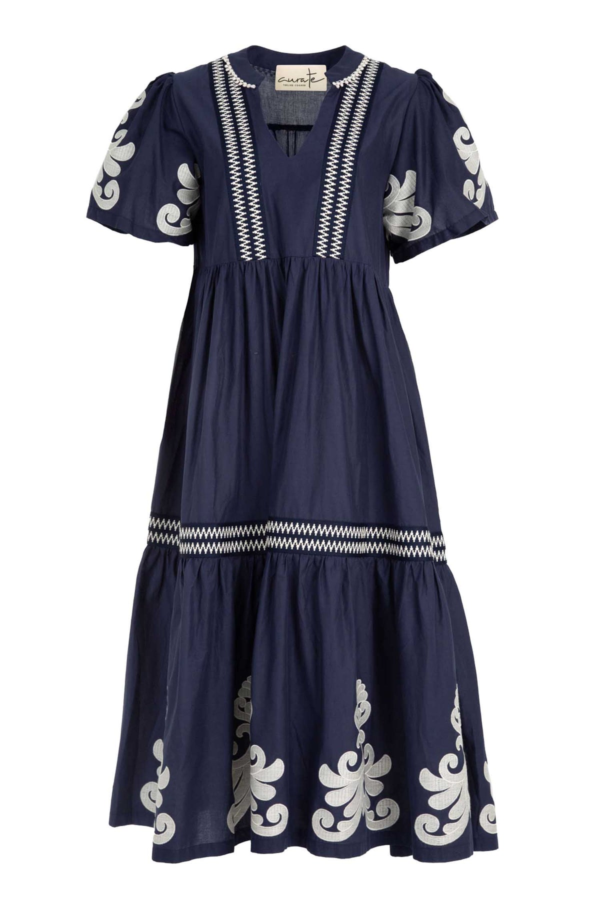 Strong embroidery and a lightweight cotton harmoniously combine in the After You My Tier Dress from Curate. Designed intelligently with everyday in mind, this dress is crafted in the ‘Navy in Love’ cotton with a bold, contrasting embroidery. A full, tiered skirt, gathered sleeves and a notched neckline make this pull-on dress a desk-to-dinner savior.