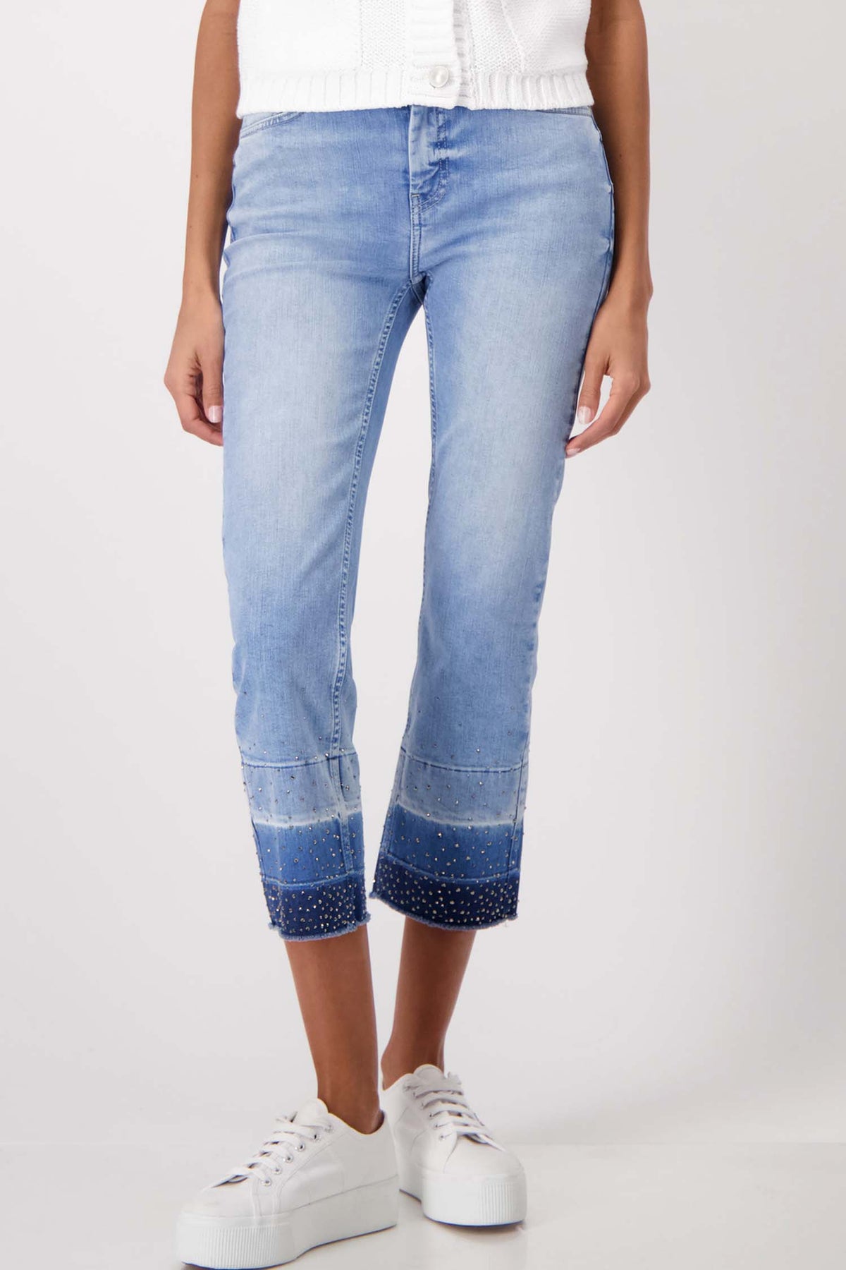 The Cropped Gradient Jeans w Rhinestones from Monari is crafted from high quality cotton blend, making them durable and comfortable, ensuring a slim fit with a normal rise. Features 5 pocket style and gradient with rhinestone embellishments, offering practicality while also adding a touch of sophistication. These 7/8 length jeans seamlessly combine fashion and comfort, making them perfect for any occasion.