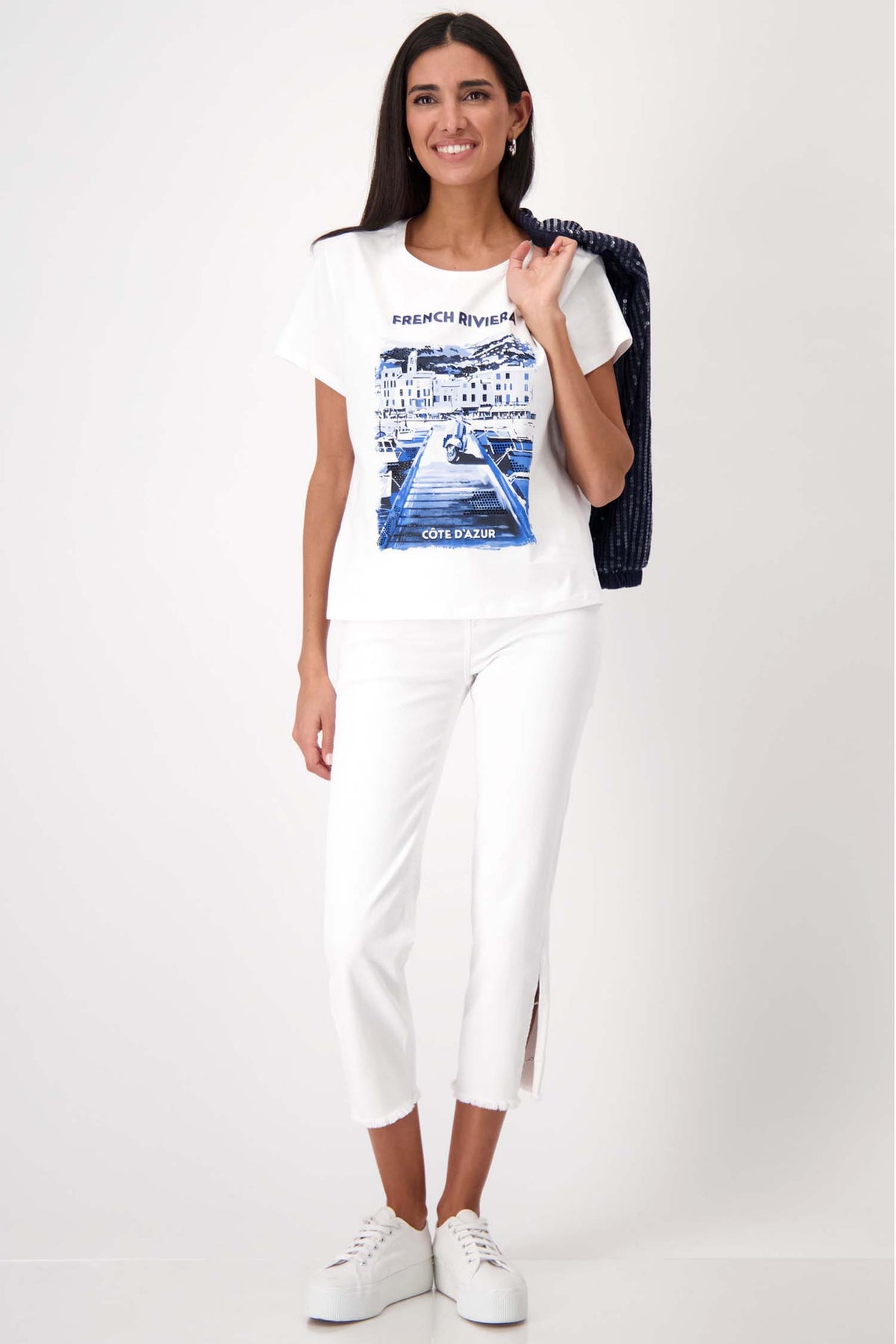 Do you dream of a T-shirt thats not only comfortable but also stylish? The French Riviera Print SS T-Shirt from Monari offers a unique 'French Riviera' print will add a touch of luxury and elegance to your everyday wardrobe. Made from high quality cotton-modal blend, making it soft and comfortable to wear. The round neck and short sleeves create a timeless silhouette that will compliment any outfit.