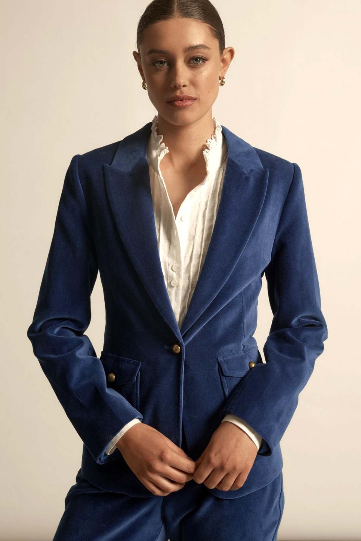 A classic redefined. The Glace Jacket from Zoe Kratzmann brings depth and quiet drama to tailoring through texture, line and considered detail. This classic blazer silhouette with a full-length, structured shape features soft yet sleek lapels that create a refined, modern line. The double darts above two sharp pockets gives the jacket subtle shaping. Finished with classic ZK brass buttons for a signature touch. Designed to elevate both everyday and occasion dressing with ease, pair seamlessly with the matching Noble Pant.