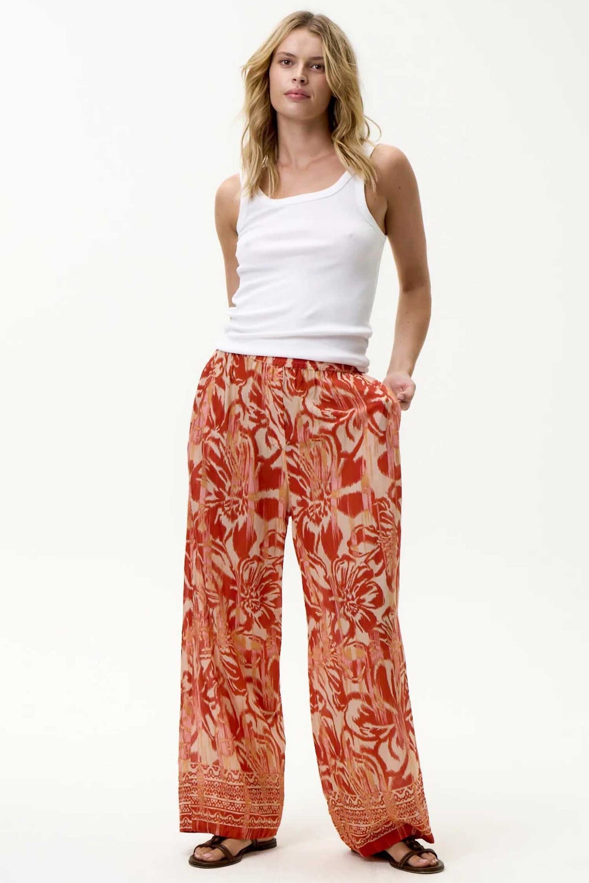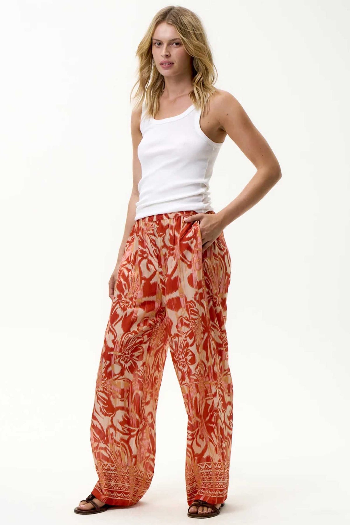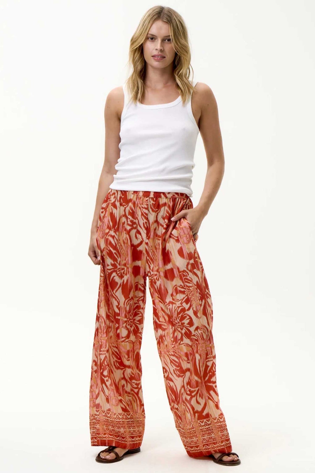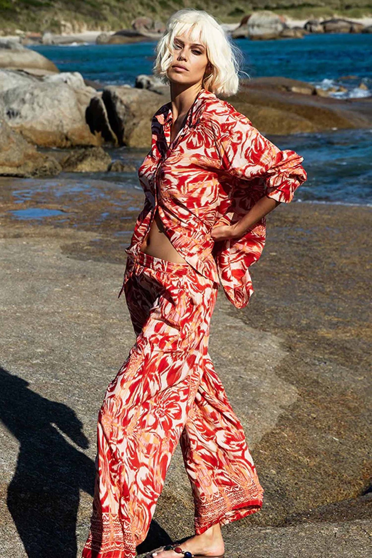 Crafted with a painterly floral motif in sun-washed hues of coral, ochre and blush, the Isla Pant in Procida from One Season evokes effortless Mediterranean ease. Designed in breathable ‘sushi voile’, this wide-leg silhouette features a softly elasticated waistband and delicate border print at the hem for a bohemian finish. Style yours with the matching Claudia Shirt for a coordinated seaside ensemble or pare back with a crisp white tank and sandals for market strolls and poolside lunches.