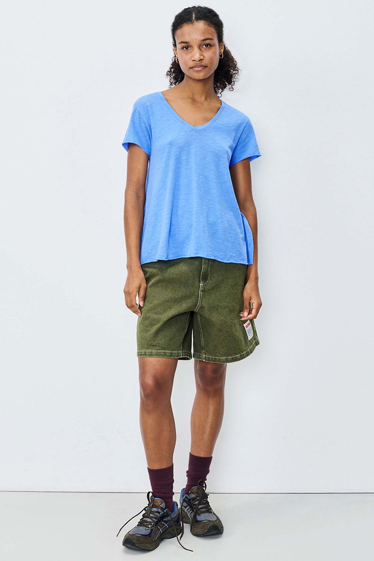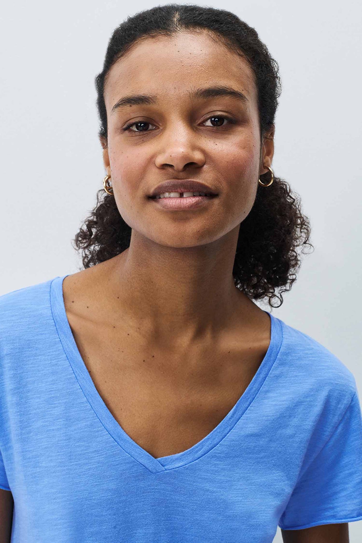 The Jacksonville V-Neck SS T-Shirt in Vintage Celestial by American Vintage features a V neckline and short-sleeves which makes this the perfect mix for comfort. The V neck t-shirt is an signature essential from The American Vintage collections. The t-shirt is in vintage celestial which is a very cool but dreamy colour. It is made from cotton-viscose blend, which makes it feel light and flexible to wear. The Jacksonville V-Neck SS T-Shirt is loved for its simple lines and effortless wearability. The V neckline gives a feminine touch and is easy piece to style all year round.