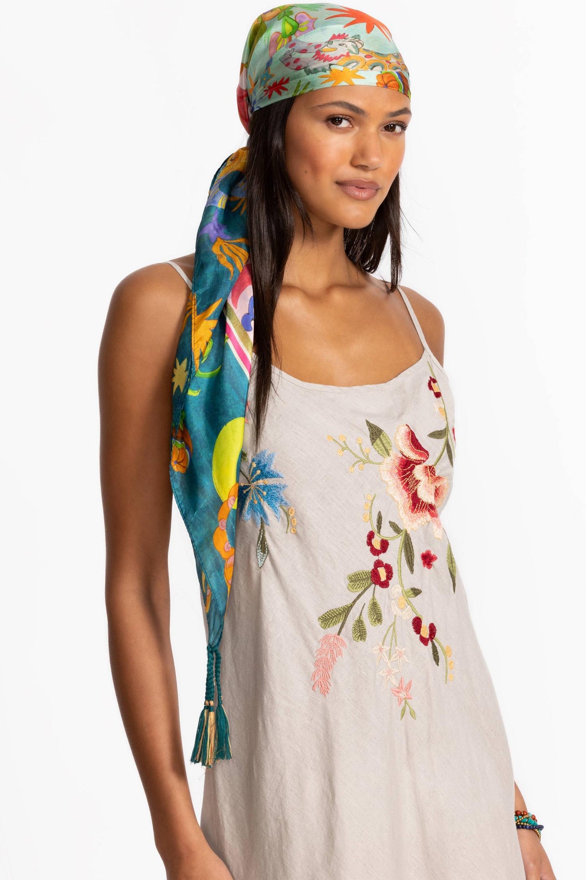 The Stevies Garden Janie Fav Boatneck Cap Sleeve Dress from Johnny Was is crafted from 100% silk and adorned with vibrant colours and elegance. Its designed with abstract prints and finished with tassels at each corner for the added flair. Features Johnny Was' signature Kayla print, a vibrant array of florals, suns, moons and celestial creatures. Wear this loosely on your neck or at the handle of your favourite bag for a pop of style.