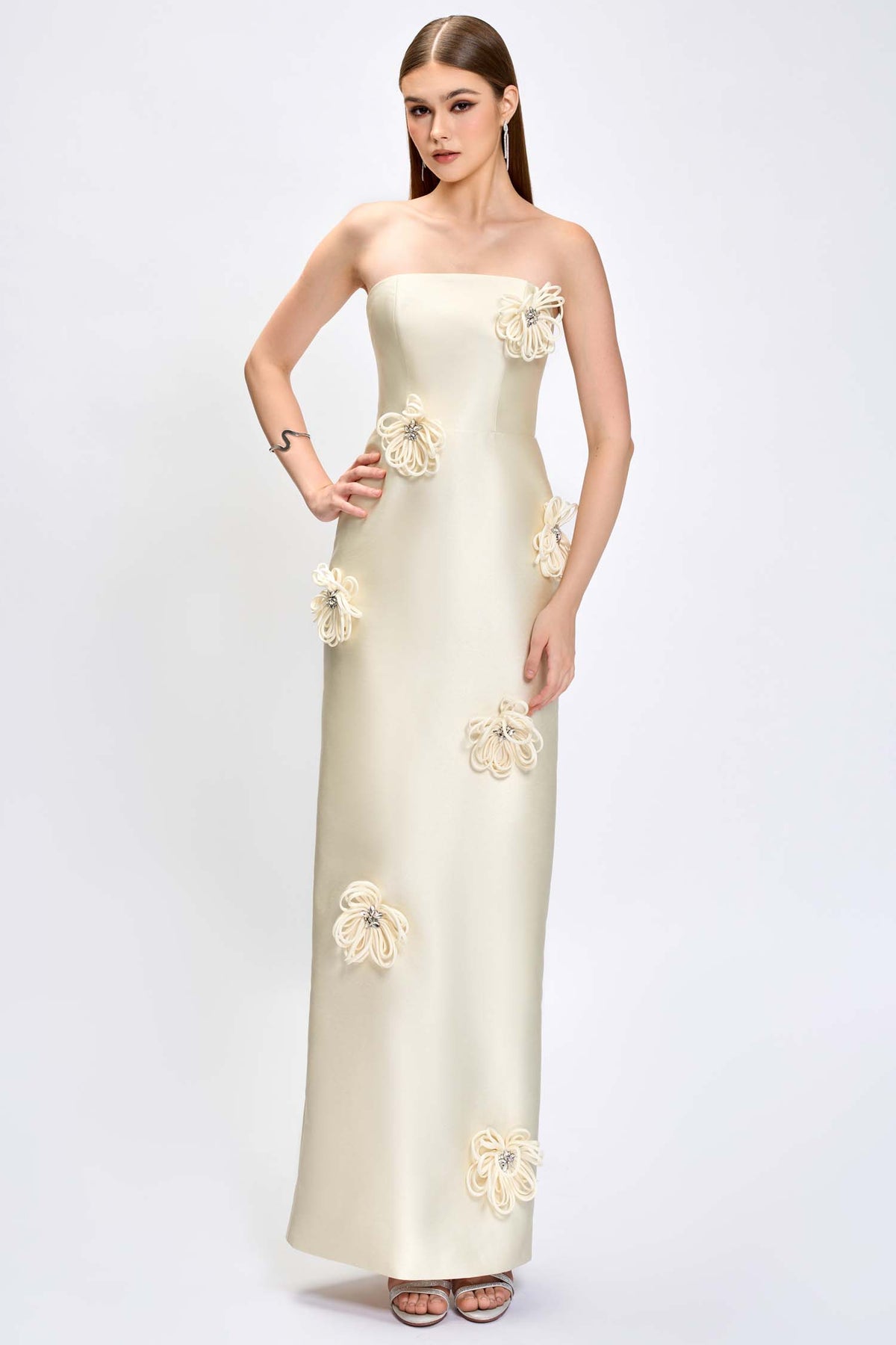 The Kezia 3D Floral Maxi Dress in Cream by Bariano is a full length gown, features a strapless straight neckline and structured bodice with built in cups, giving it a flattering silhouette while also providing support. Made from thick, luxurious satin and 3D floral appliques, adding a touch of grace. Fully lined and finished with an invisible back zip, this gown is both elegant and romantic, perfect for any formal event or special occasion.