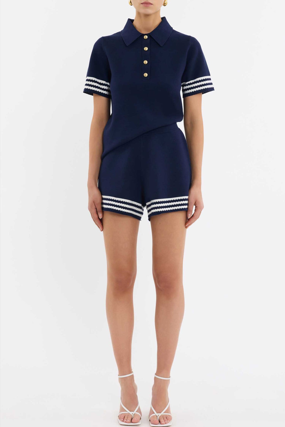The Mayflower Top w Stripe from Rebecca Vallance in navy brings effortless refinement to casual styling. Crafted from fine-knit Milano, it features short sleeves with contrast chevron detailing and a sleek collared neckline that shape a chic silhouette. A gold press-snap front placket adds a touch of sophistication. Blending comfort with style, this versatile top pairs seamlessly with our matching Mayflower Short.