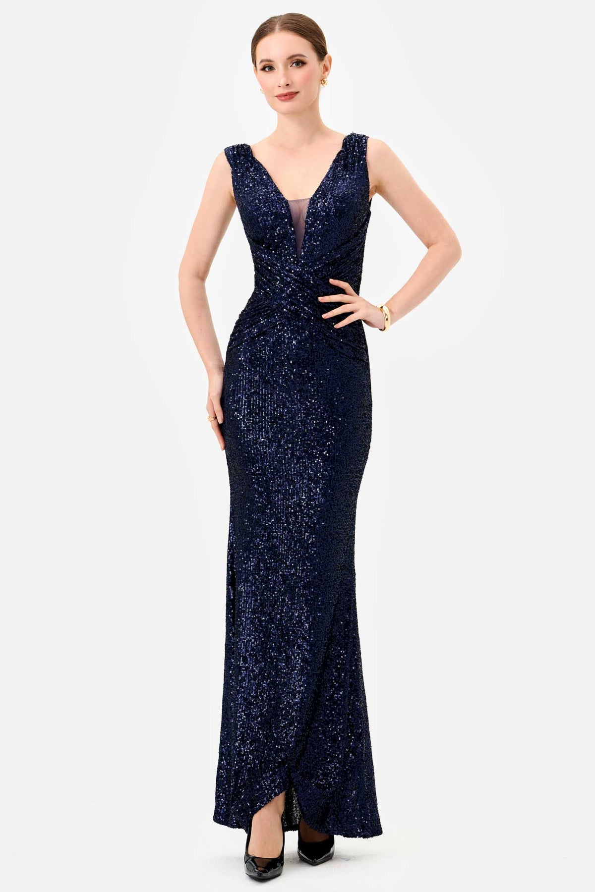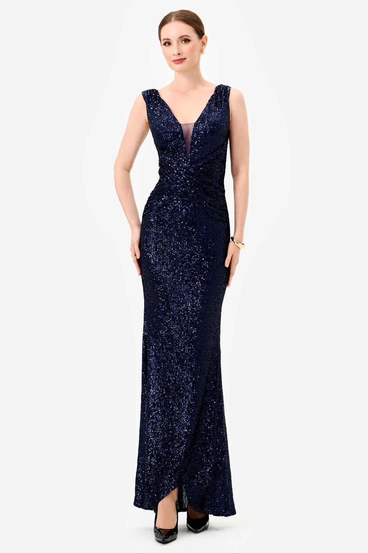 The Paislee Sequin Maxi Dress in Navy by Bariano features a deep V-neckline with a mesh insert and wide shoulder straps for support. With the added crossover draped bodice and full length skirt, the gown gives you a flattering silhouette and wrapped waistline. Made from sequins, fully lined and secured with an invisible zip ensuring you're always looking your best. Perfect for your next evening event.
