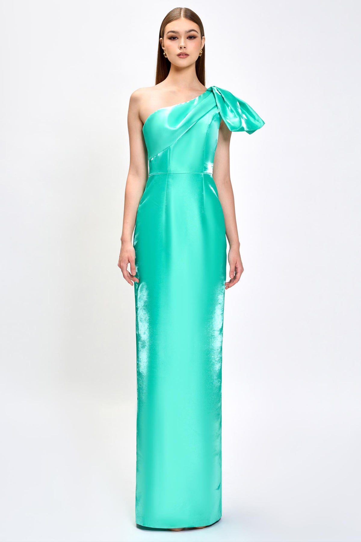 The Talitha One Shoulder Maxi Dress in Aqua by Bariano, a full length gown made from luxurious high-sheen organza, giving a sleek and structured finish. Features an asymmetrical one-shoulder neckline with a statement bow detail, adding a modern flair. Offers a fitted bodice with built in bust cups and a subtle panel seaming, ensuring a flattering silhouette while also providing support. It's full length column skirt includes a back split for elegant movement. Fully lined and finished with an invisible back zip, this gown is both sophisticated and dramatic, perfect for any formal event.