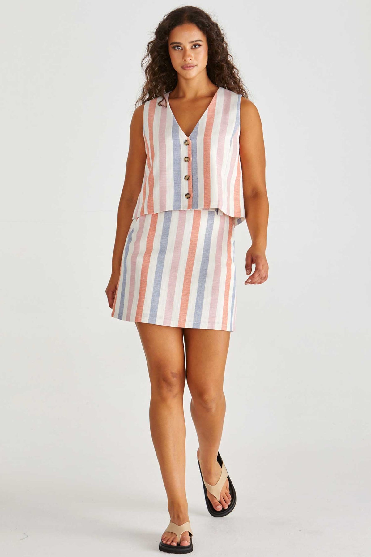The Travis Skirt in Stripe from SASS is a classic with a twist. Crafted from textured fabric with a fun multi-stripe, this skirt features side pockets and a hidden zip and is flattering and easy to wear. Style with the matching vest for an effortless co-ord moment or pair with a plain white shirt and heels for a more dressy look.