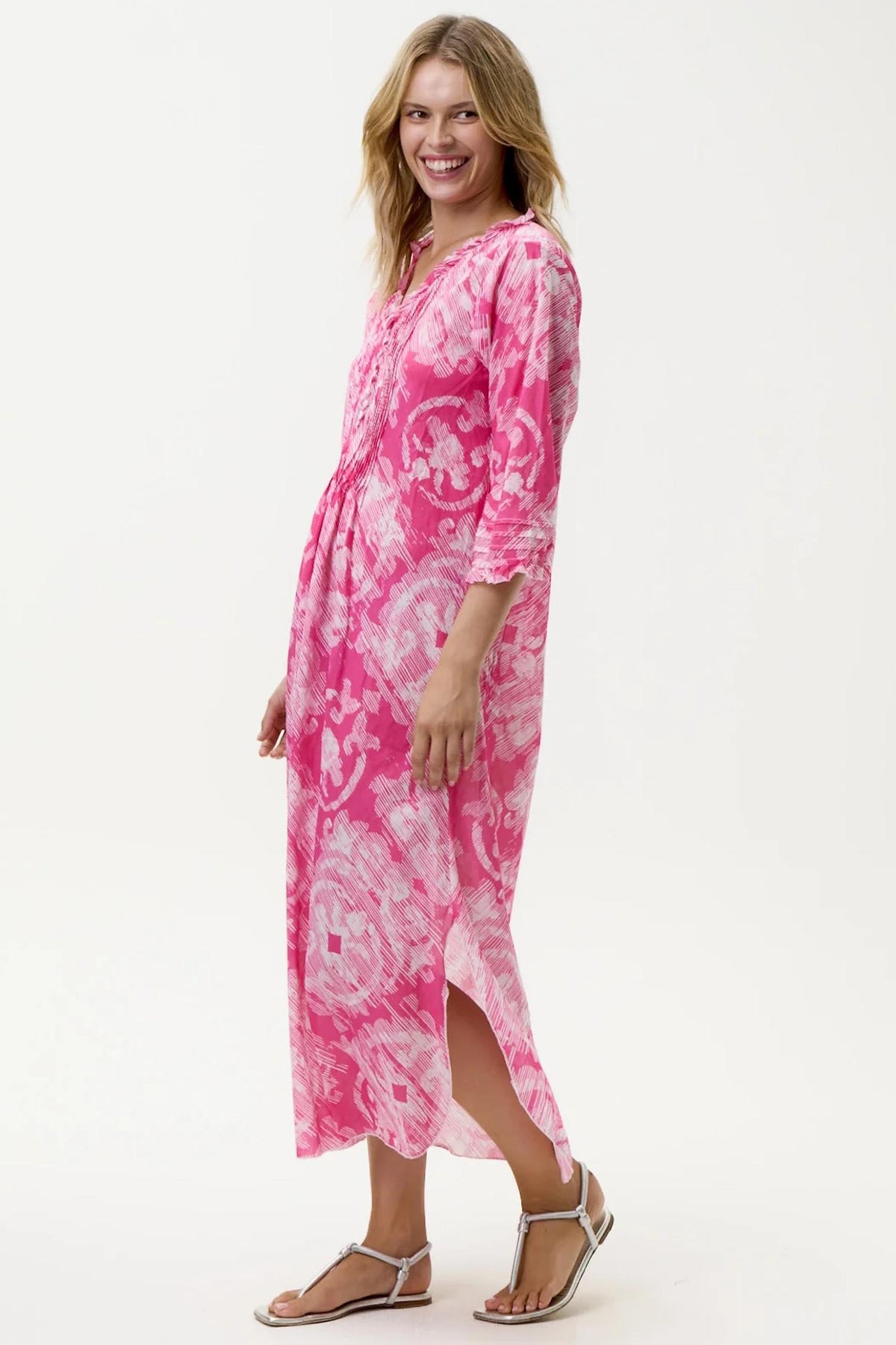 The 'Praiano' print, a graphic pink and white medallion motif, evokes vintage Italian tilework with a contemporary punch of colour. Crafted from lightweight, breathable cotton, it features the label’s signature pintuck detailing through the bodice, a buttoned neckline, and softly gathered skirt that falls to an elegant ankle length. Style it with strappy sandals and oversized sunglasses for effortless resort glamour.