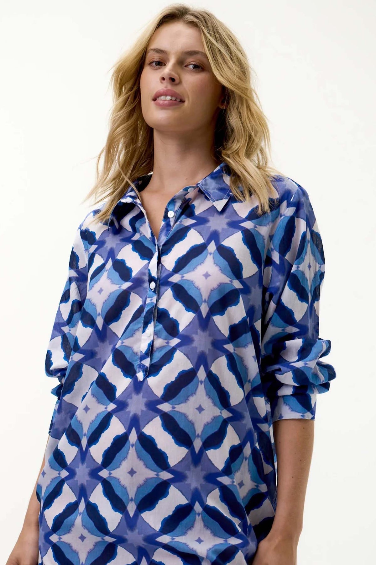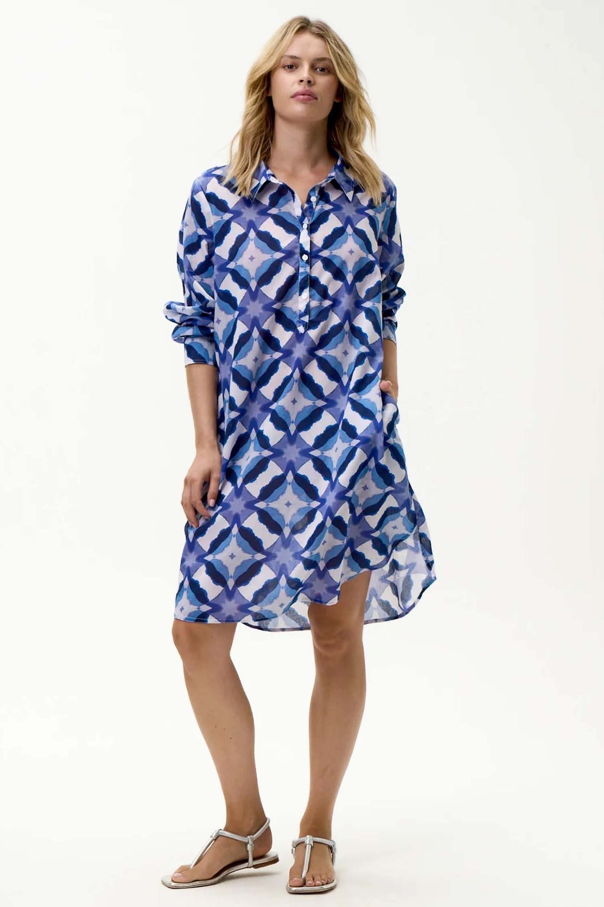 One Season’s Middy Gilli Dress in Floreat is made from breezy washed cotton with a geometric motif in shades of cobalt and sky blue that lends a playful yet refined coastal energy – it’s the perfect piece for spring or summer casual occasions. Designed for a relaxed, oversized fit, it has a classic collar, short placket and bracelet length sleeves with button-cuffs, then falls to a curved midi hem just above the knees. Layer yours over a swimsuit.