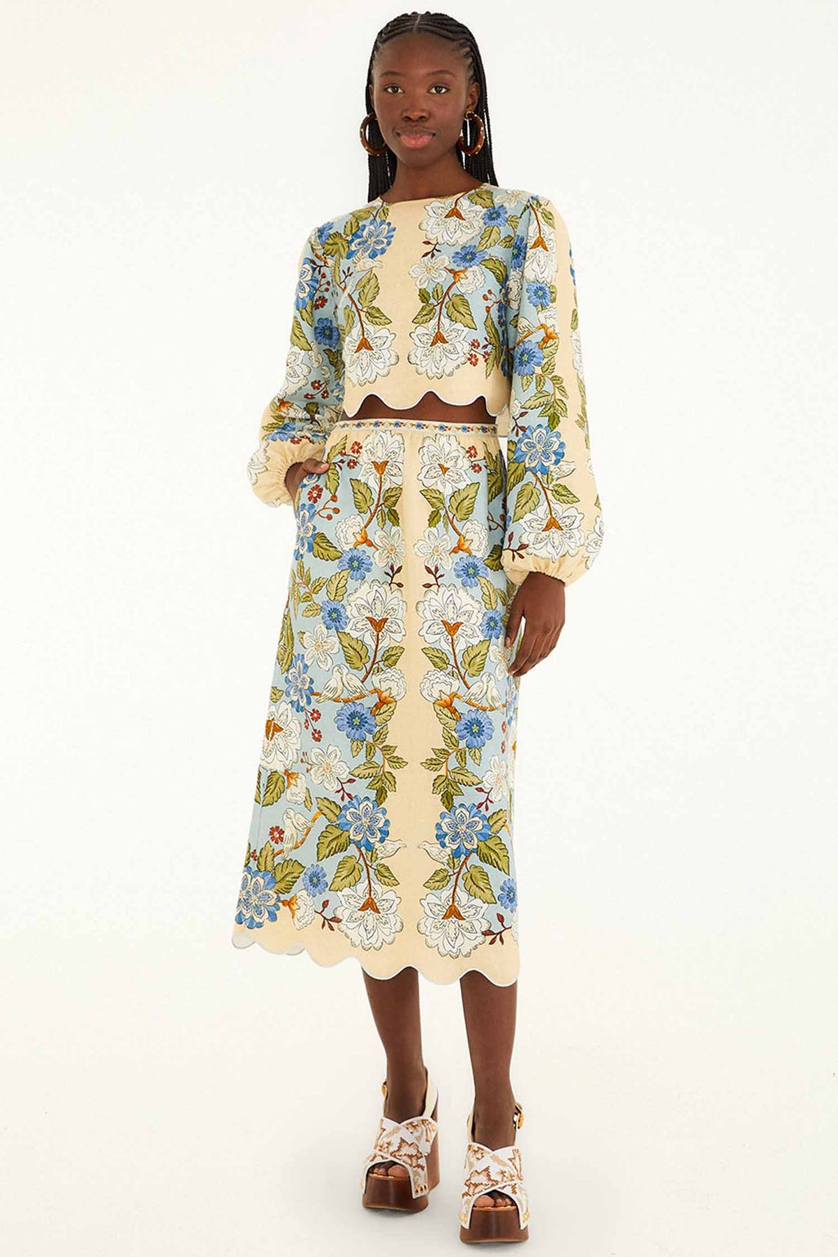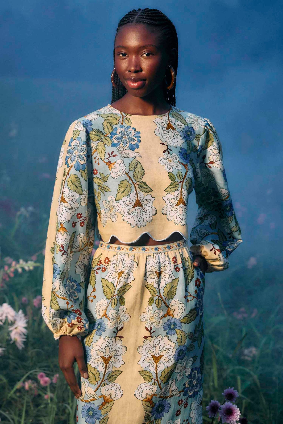 The Garden Scarf Blue LS Blouse from Farim Rio brings a delightful mix of sweetness and edge to your wardrobe with its vibrant, blossom-tossed pattern. Crafted entirely from linen, the texture is airy and light, inviting a breezy feel that’s just right for sun-drenched adventures or sultry evenings. The scalloped, cropped hemline adds a playful twist, while the jewel neck lends an understated elegance, making it a versatile player in any fashion arsenal. It’s a canvas of whimsy and charm, perfect for those who love to embrace bold prints with a hint of sophistication.