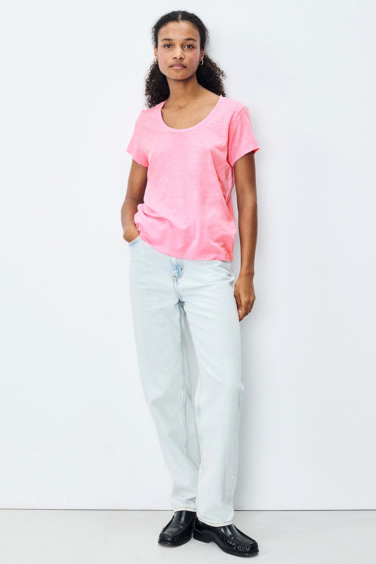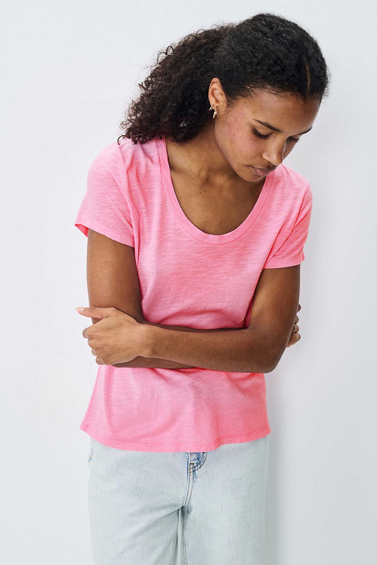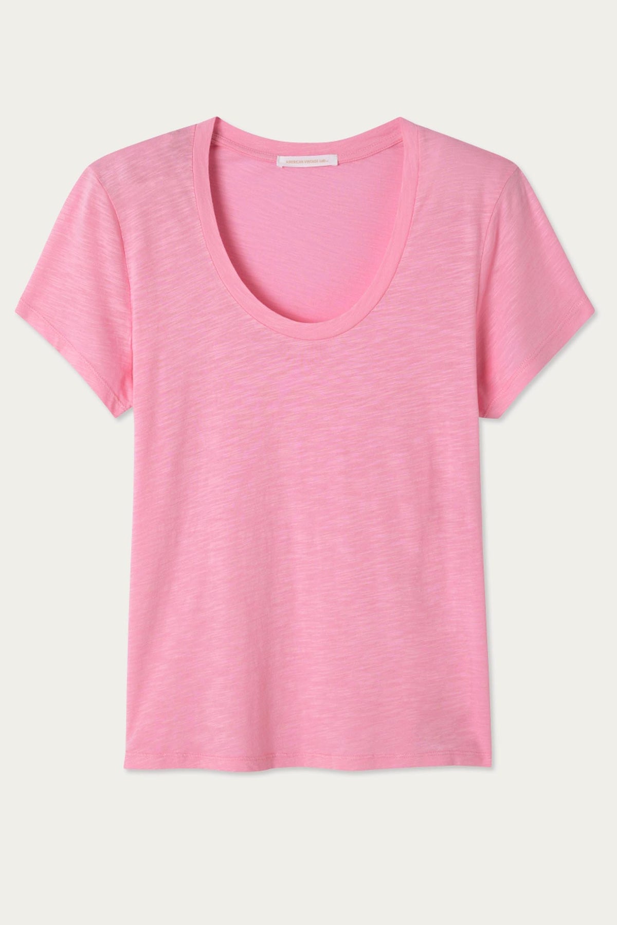 The Jacksonville U Collar SS T-Shirt in Vintage Kiss by American Vintage features a scoop neckline and short-sleeves which makes this the perfect mix for comfort. The vintage kiss hue is very natural and modest. It is made from cotton-viscose blend, which makes it feel light and flexible to wear. Jacksonville U Collar SS T-Shirt is loved for its flattering cut and everyday wearability. It creates a beautiful silhouette that drapes gently on the body. Its perfect on its own but can be paired with a denim jacket or cardigan.