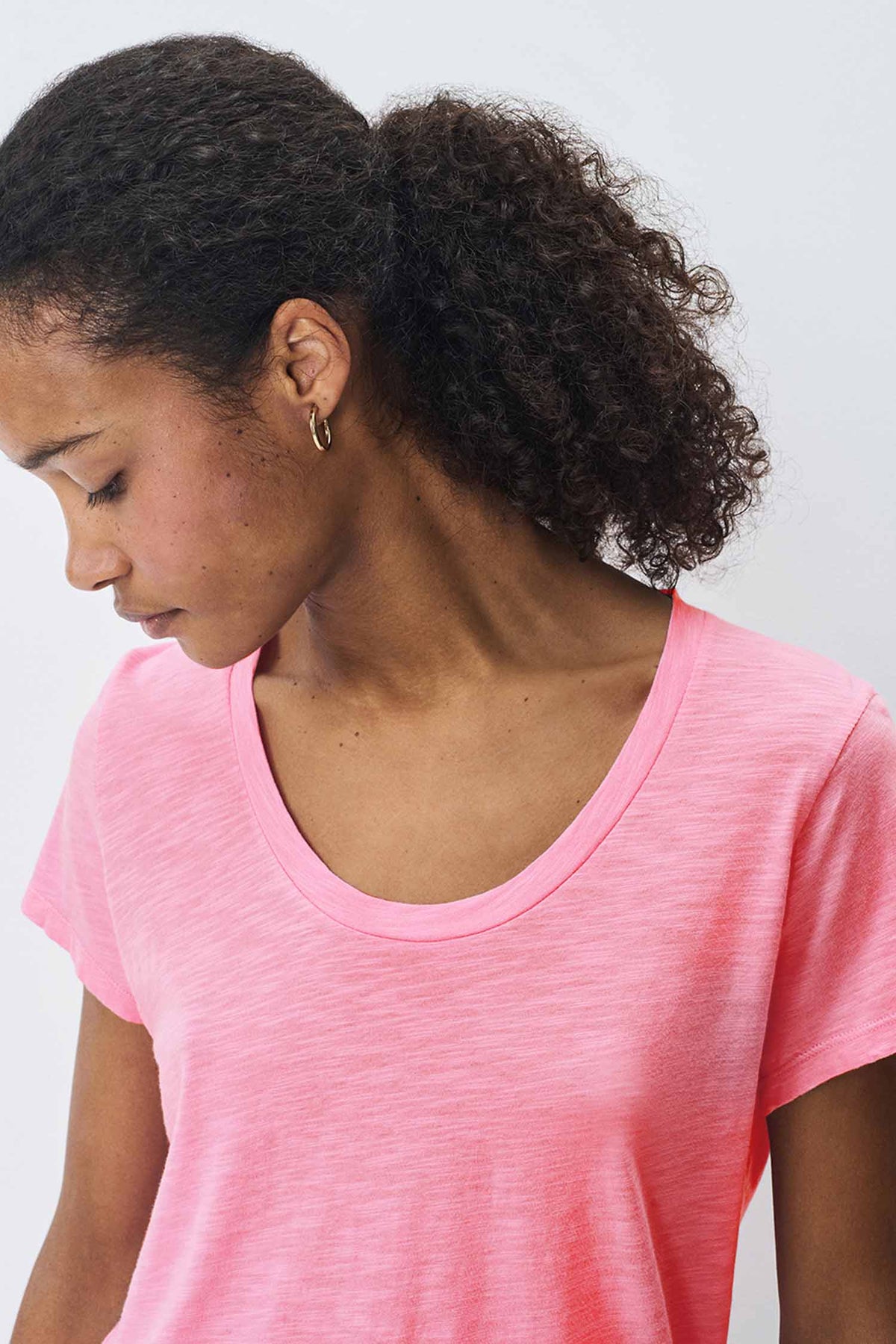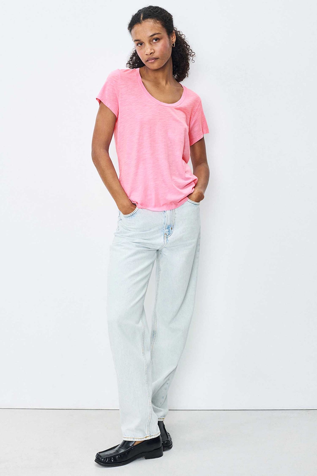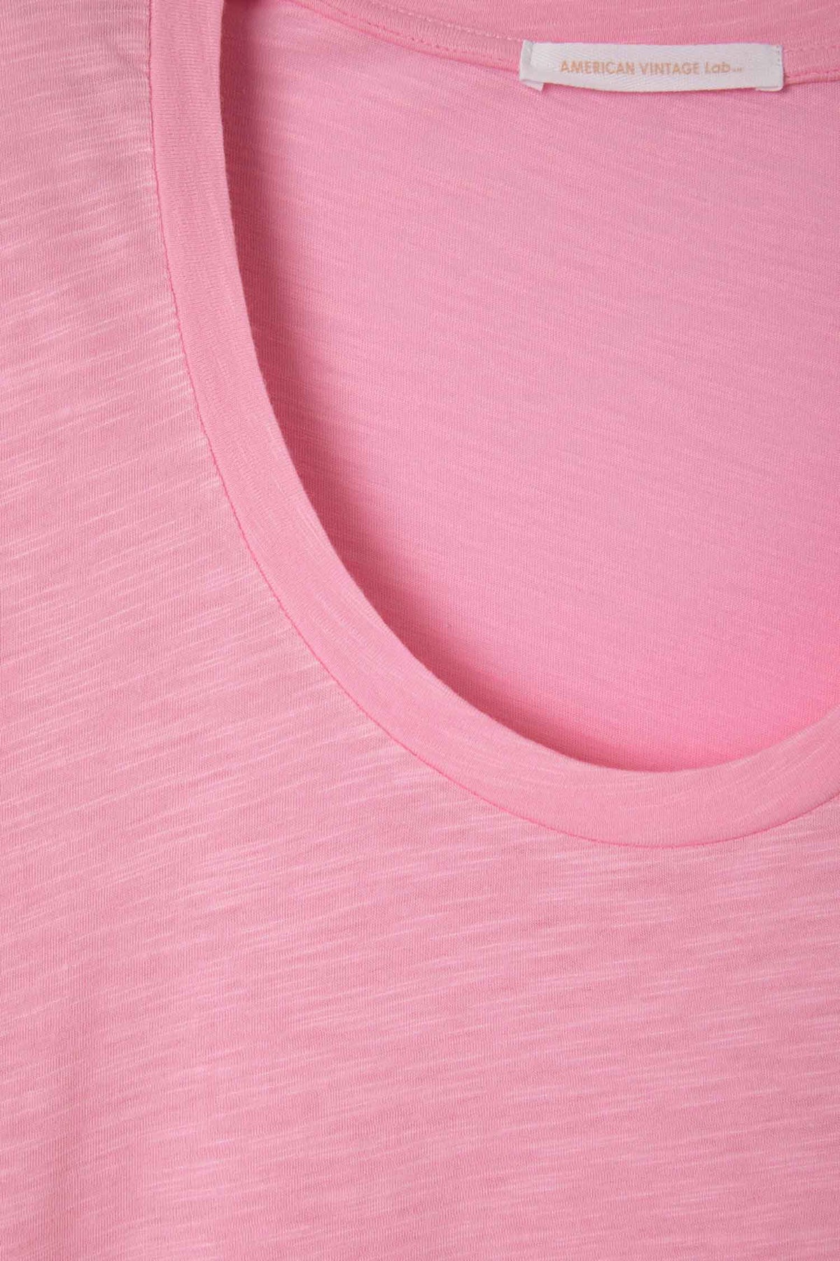 The Jacksonville U Collar SS T-Shirt in Vintage Kiss by American Vintage features a scoop neckline and short-sleeves which makes this the perfect mix for comfort. The vintage kiss hue is very natural and modest. It is made from cotton-viscose blend, which makes it feel light and flexible to wear. Jacksonville U Collar SS T-Shirt is loved for its flattering cut and everyday wearability. It creates a beautiful silhouette that drapes gently on the body. Its perfect on its own but can be paired with a denim jacket or cardigan.