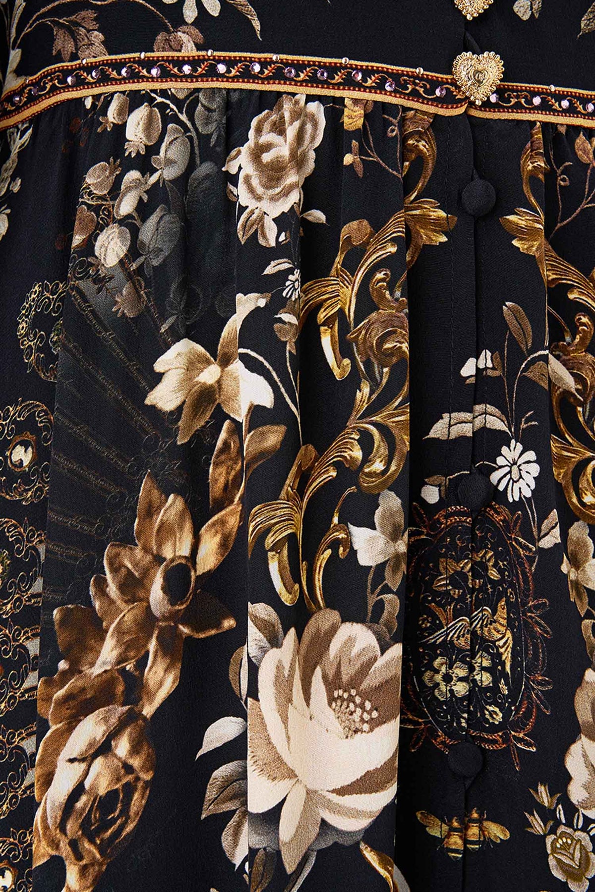 The Shaped Waistband Dress with Gathered Sleeves in Flamenco Folklore is a Camilla handcrafted silhouette designed by their in-house artisans. Imagined in an exclusive limited-edition print, the silk, shaped waistband dress features a v-neckline, framed by a front button fastening that meets a shirred back for adjustable comfort. Its soft, gathered sleeves cascade beside the form, adding fluidity with every step. Its finished with delicate frills and intricately placed crystal embellishments.