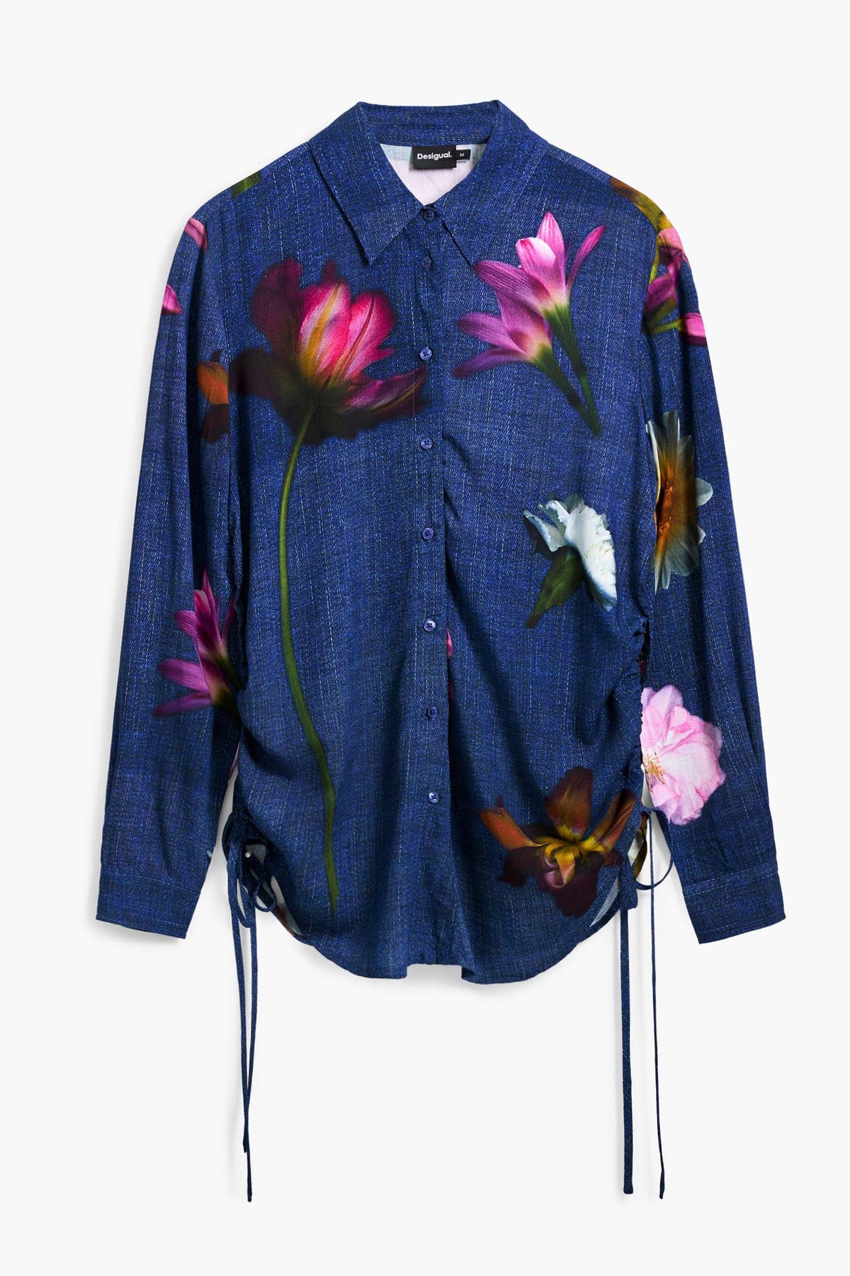 This Denim Effect Floral Shirt from Desigual brings together casual denim vibes and vibrant floral charm. Crafted with a denim-effect print base, it features a classic shirt collar, button-through front, and colourful flower designs. Side ruching with ties allows for a customisable fit, while the curved hem adds a flattering finish. Perfect for adding a playful, artistic touch to any outfit.