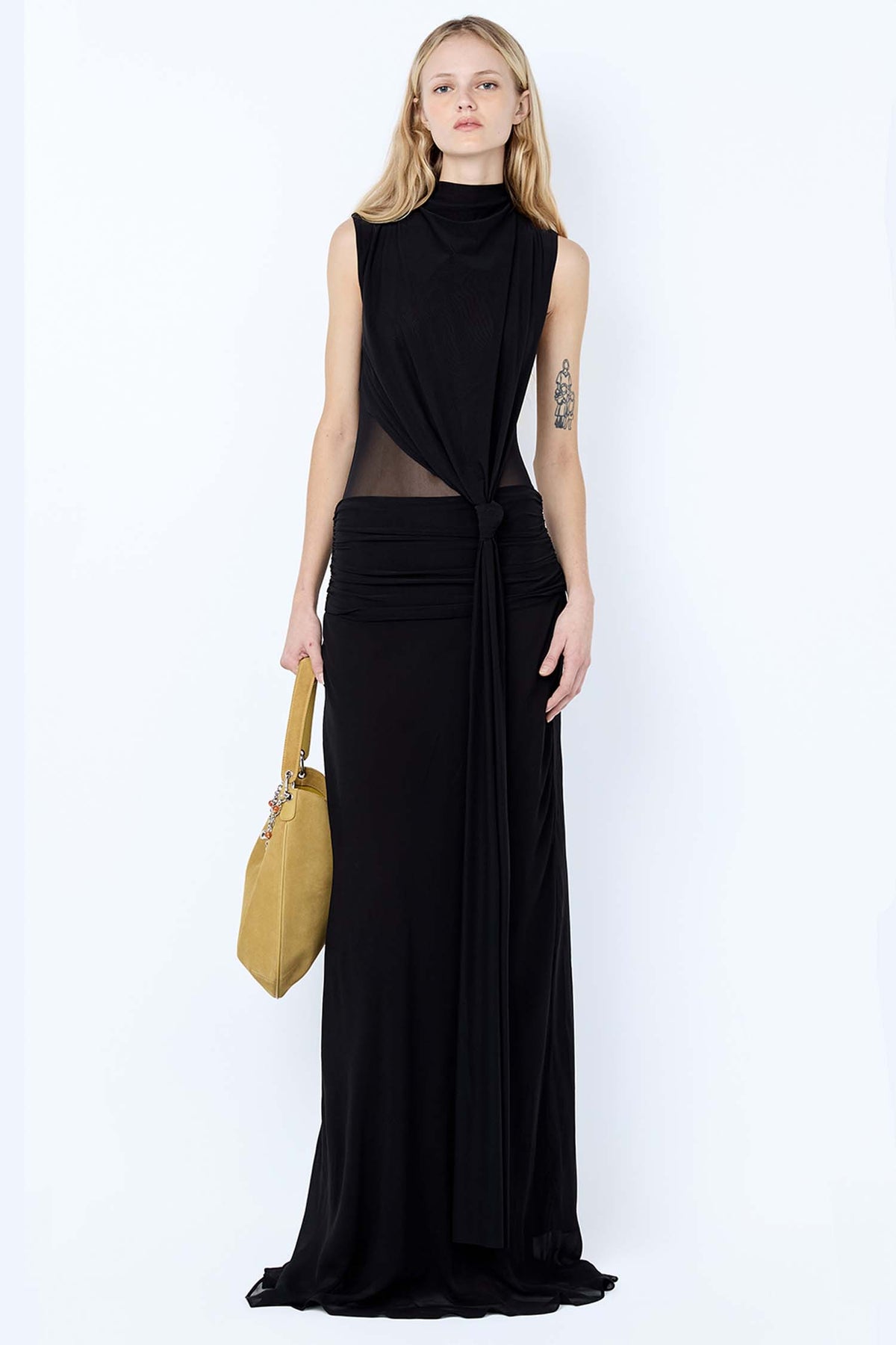 The Cassis Knit Maxi Dress in Black from Bec + Bridge is a captivating black sheer maxi dress. This sleeveless maxi dress is designed to flatter with considered draping and subtle sheerness. Featuring a high neckline and soft wrap detailing through the bodice, the design draws in at the waist with a knotted front accent that creates a sculptural focal point. Semi-sheer mesh panels at the waist and back add a modern, sensual edge, while gentle ruching through the hips enhances the figure. Falling to a fluid, floor-length hem, this dress moves effortlessly with the body - perfect for elevated events, formal evenings, or after-dark occasions.