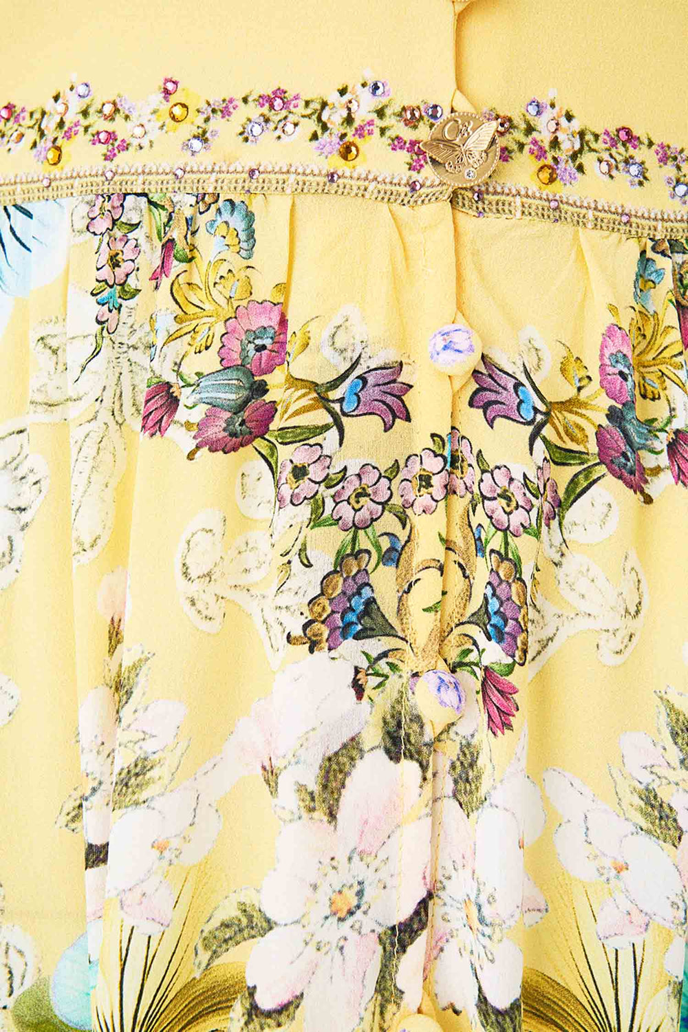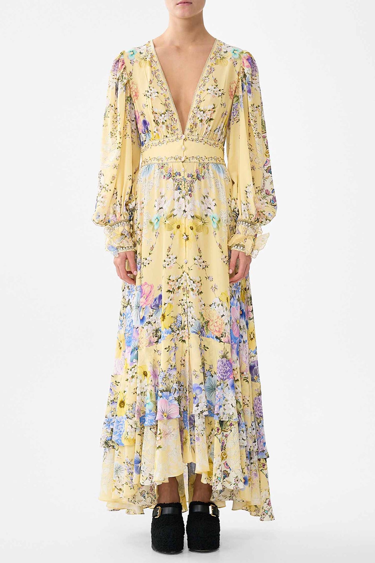 The Long Button Front Dress in Darling Buds from Camilla is a handcrafted silk silhouette designed by their in-house artisans. Reimagined in an exclusive limited edition print, this dress has a soft plunging V-neck line that meets at its shaped waistband with elastic back. It features intricate detailed buttons, crystal embellishments and a double ruffle hem.