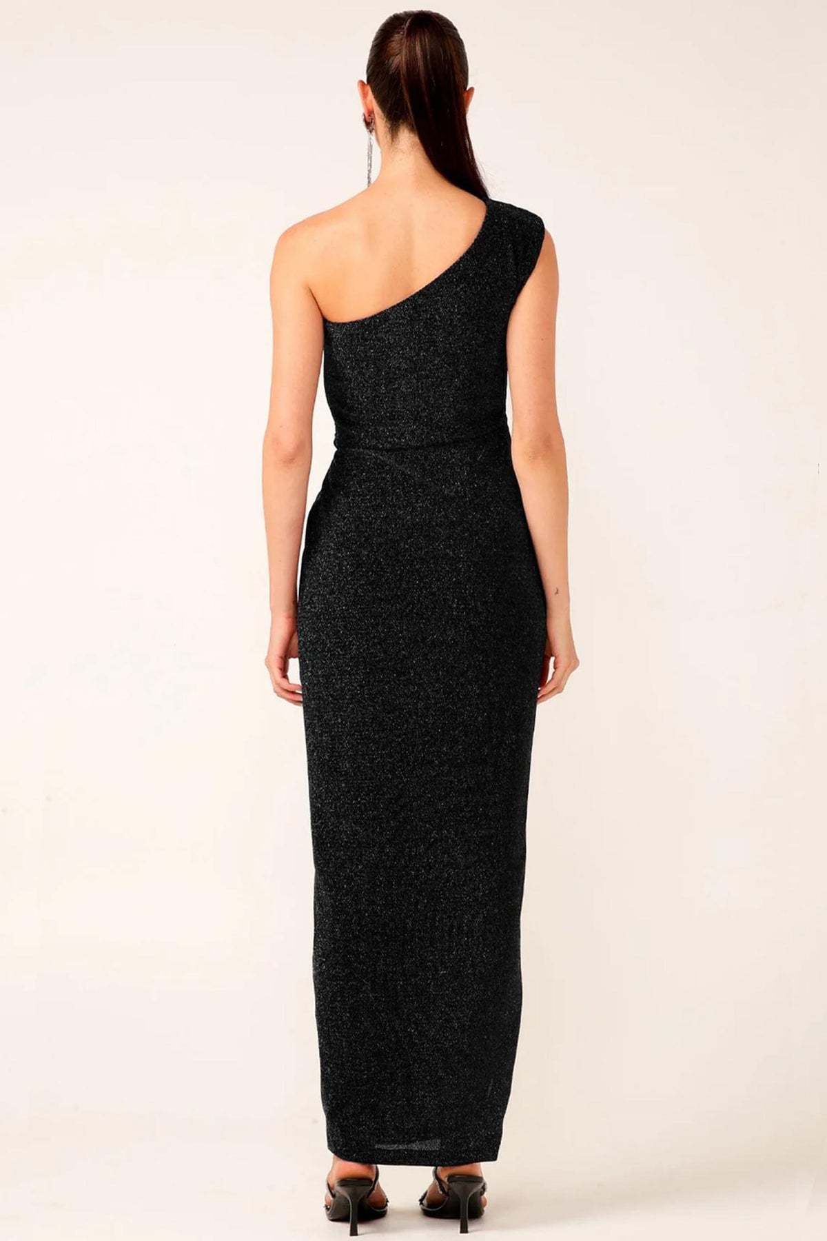 One shoulder design feature, draws the eye up and down the body creating a longer silhouette with asymmetric neckline