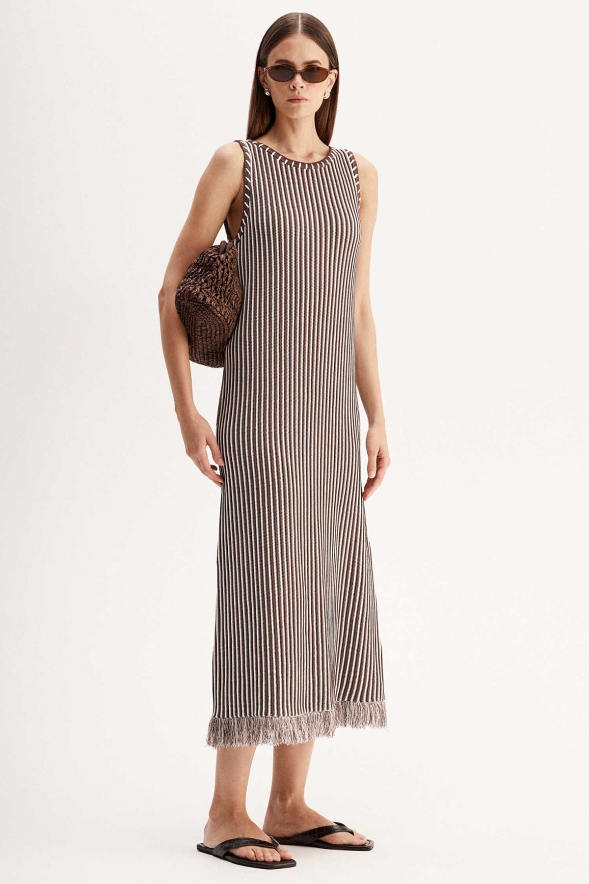 The Alessandra Maxi Dress in Chocolate Stripe from Elka Collective is made of a soft, luxe stripe knit fabric with a delicate fringe hem. Designed for elevated casual outfitting, this dress features double back ties for a customisable fit. Pair with easy slides and a Summer clutch for a chic brunch look.