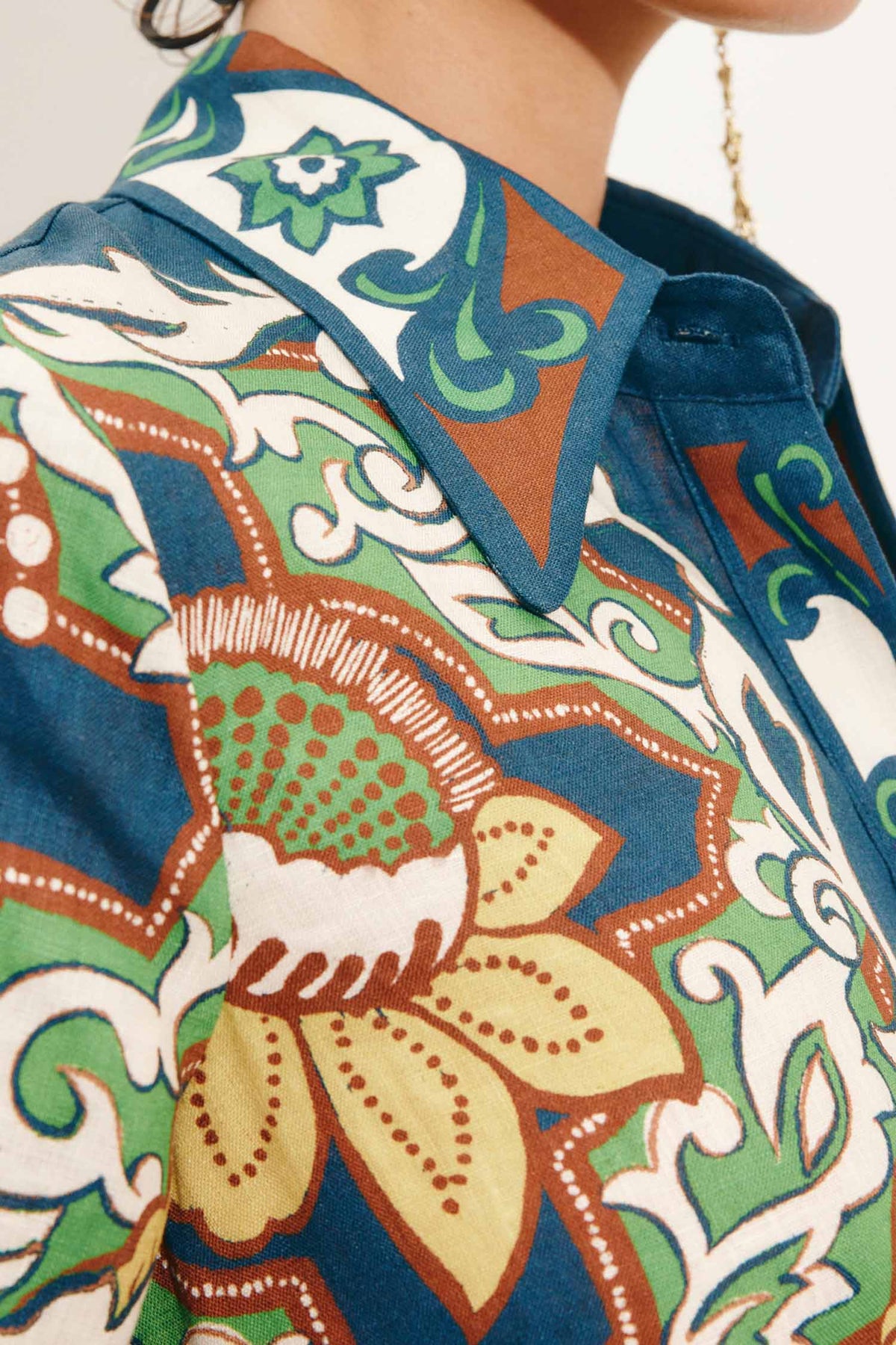 Alémais brings its spirited approach to textile artistry to a timeless Shirtdress silhouette with the Liana Shirtdress. Crafted in European Linen, this button-through midi is elevated by the artful floral pattern and contrast borders. Soft and careful touches are added to the dress with a pointed collar, a concealed button placket and self-rouleau belt. Let the vivid pattern and fitted cut speak for themselves with pared-back accessories.