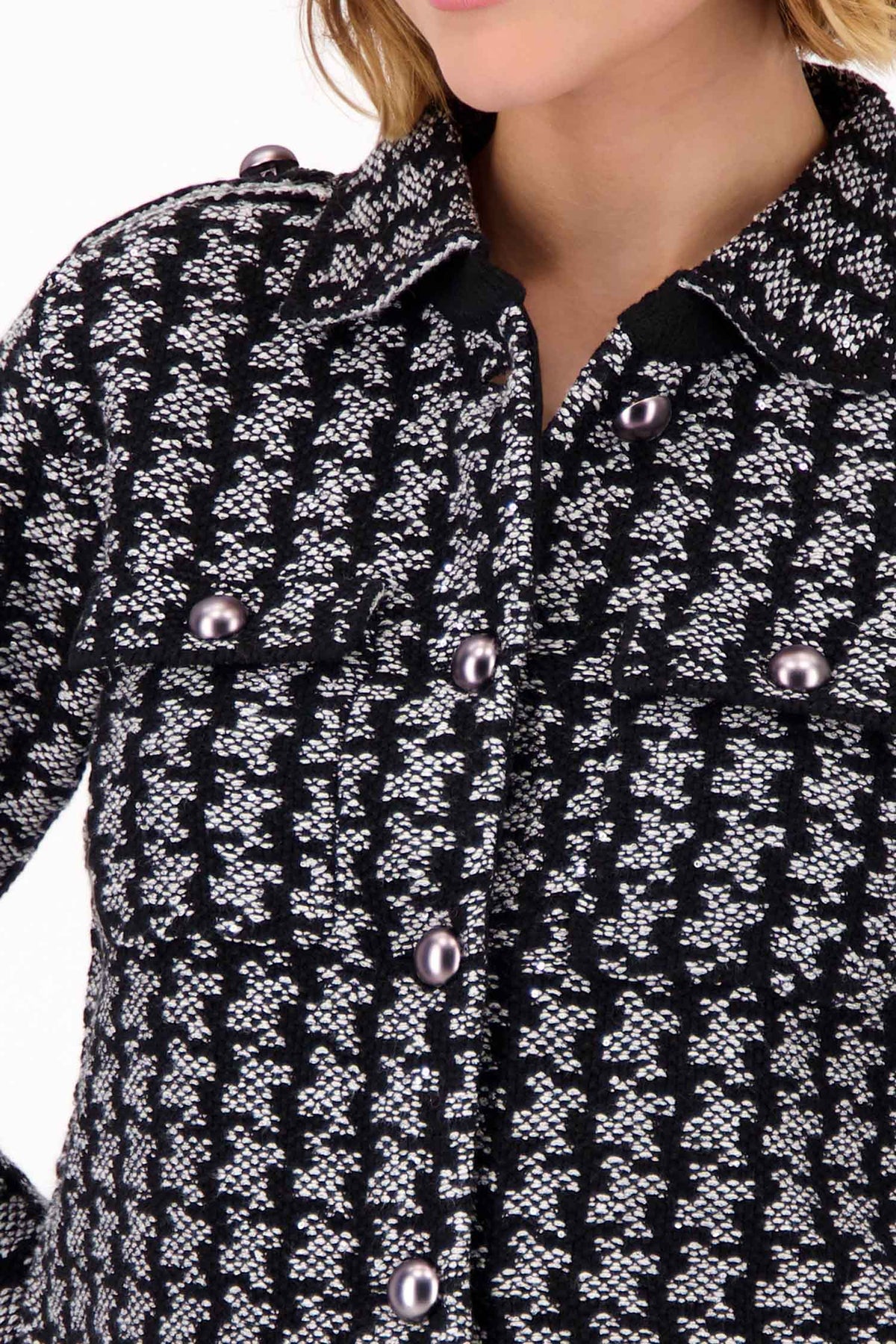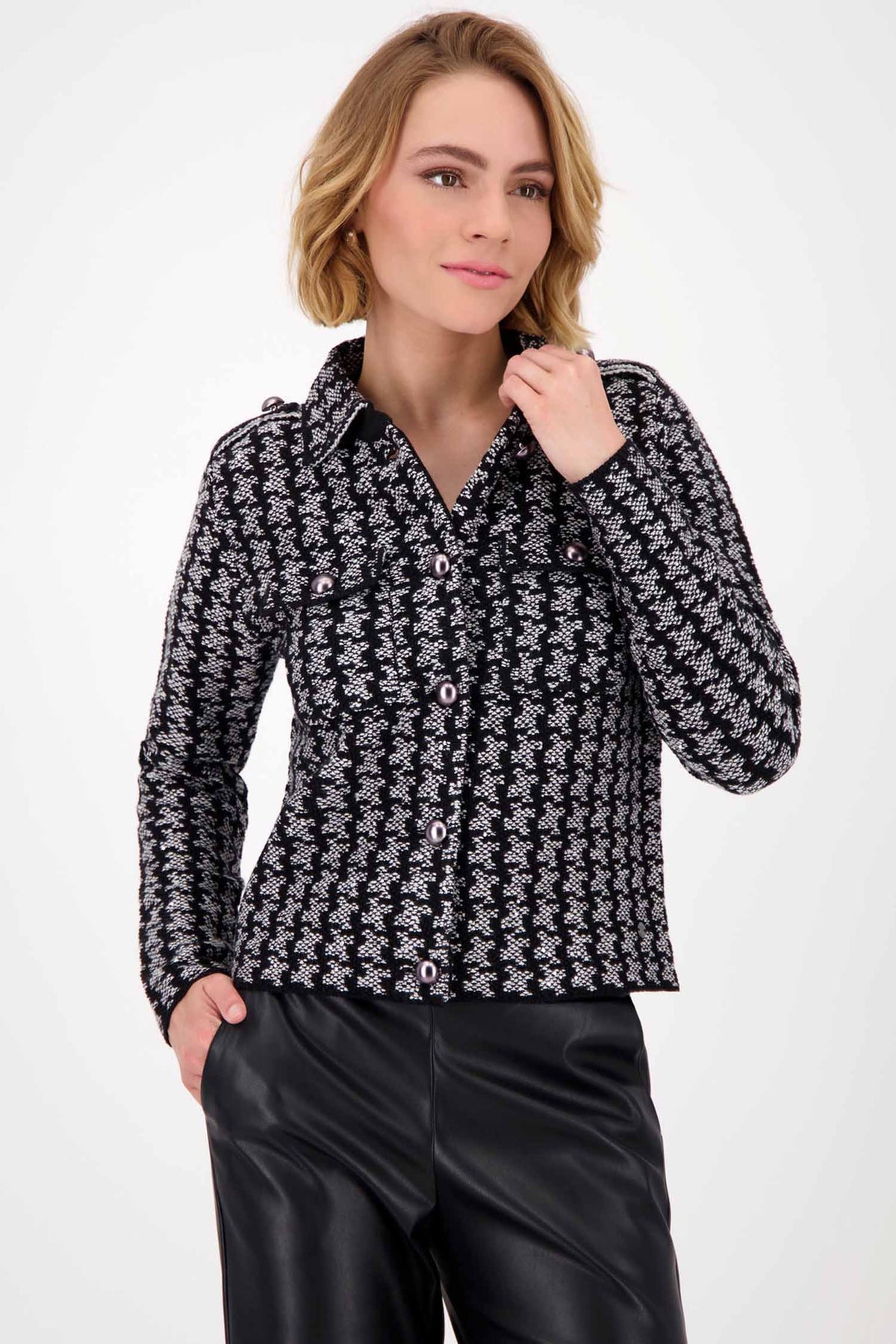 - Ash grey melange base with all-over houndstooth pattern