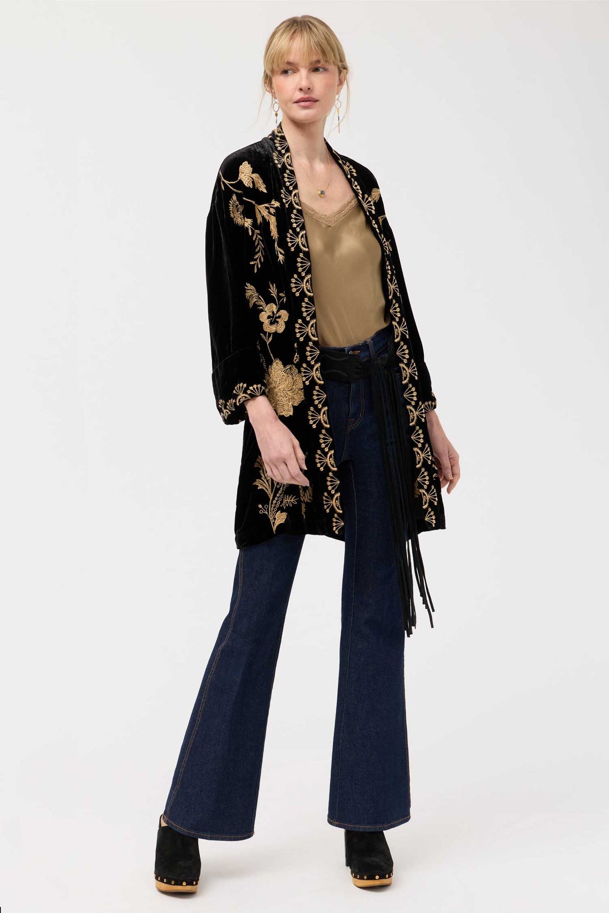 Intricately embellished with vibrant gold embroidery on a lush black backdrop, the Johnny Was Lara Velvet Kimono is crafted from a soft silk blend. Featuring an open front and wide 3/4 sleeves, this elegant kimono elevates any look. Layer over an evening dress and pair with delicate gold jewelry for a polished evening aesthetic.