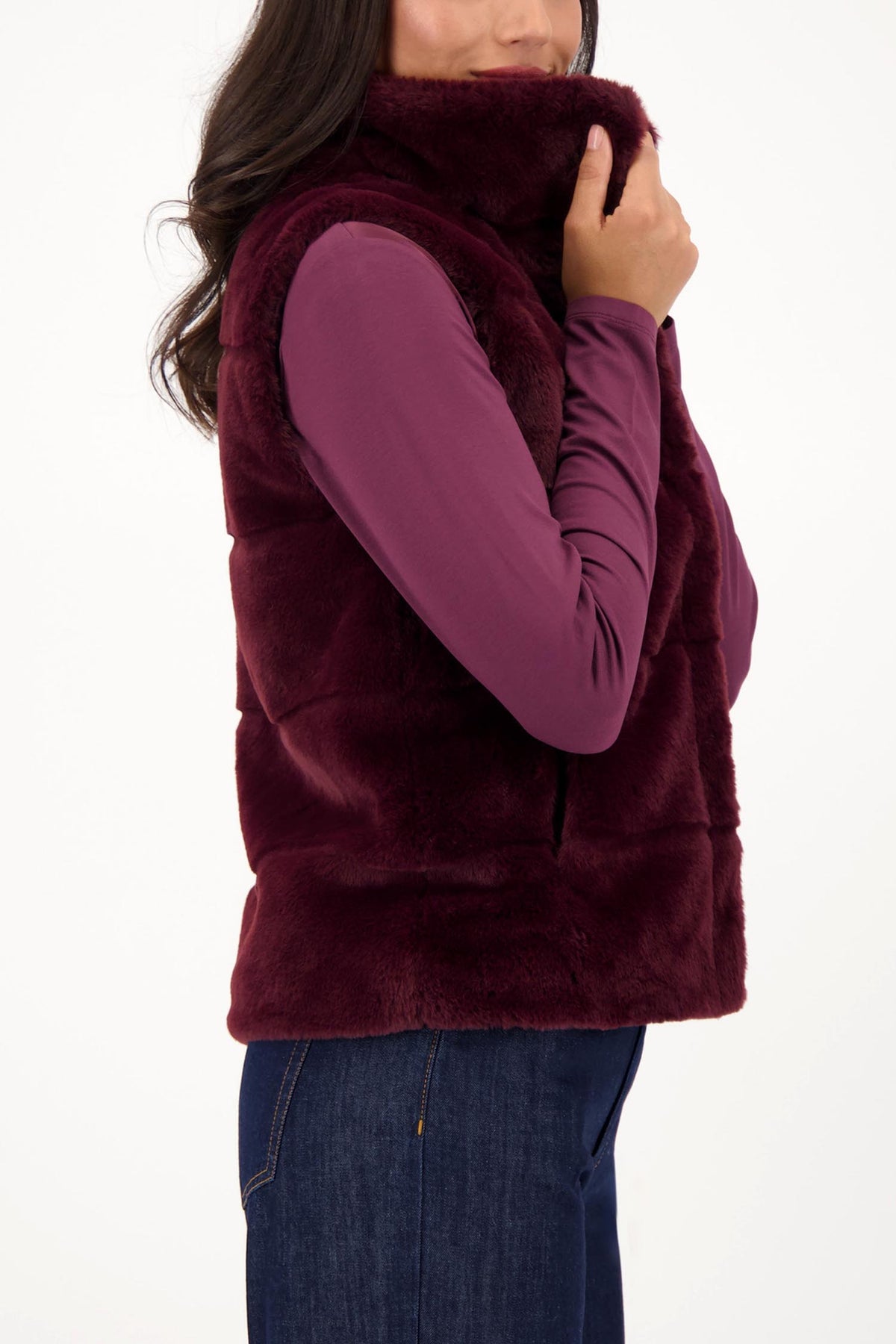 The Long Line Faux Fur Vest in Bordeaux by Monari.