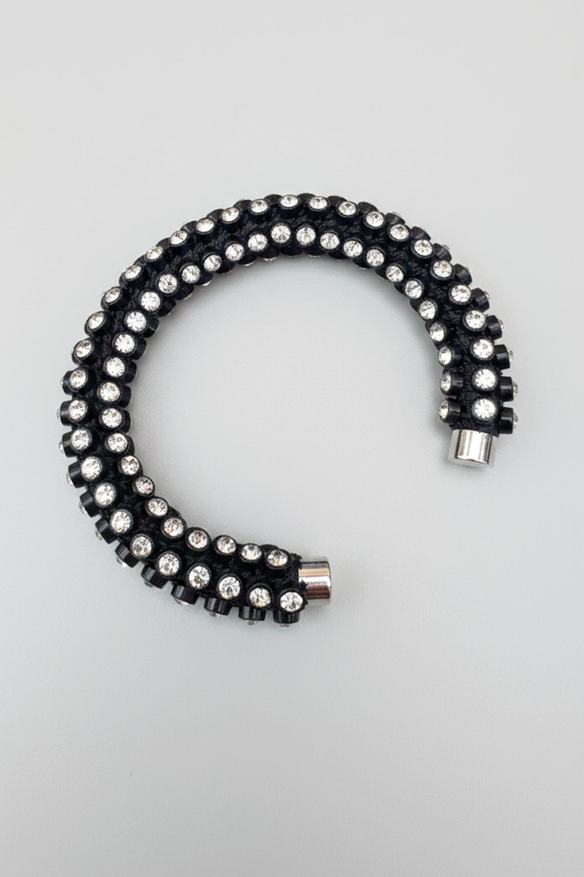 Elevate your everyday style with this striking crystal-studded coil bangle. Designed with a flexible wrap silhouette, it features two rows of brilliant, round-cut clear crystals set against a sleek black base for a bold, modern contrast. The polished metallic end caps add a refined finish, while the adjustable coil design ensures a comfortable, easy fit on any wrist.