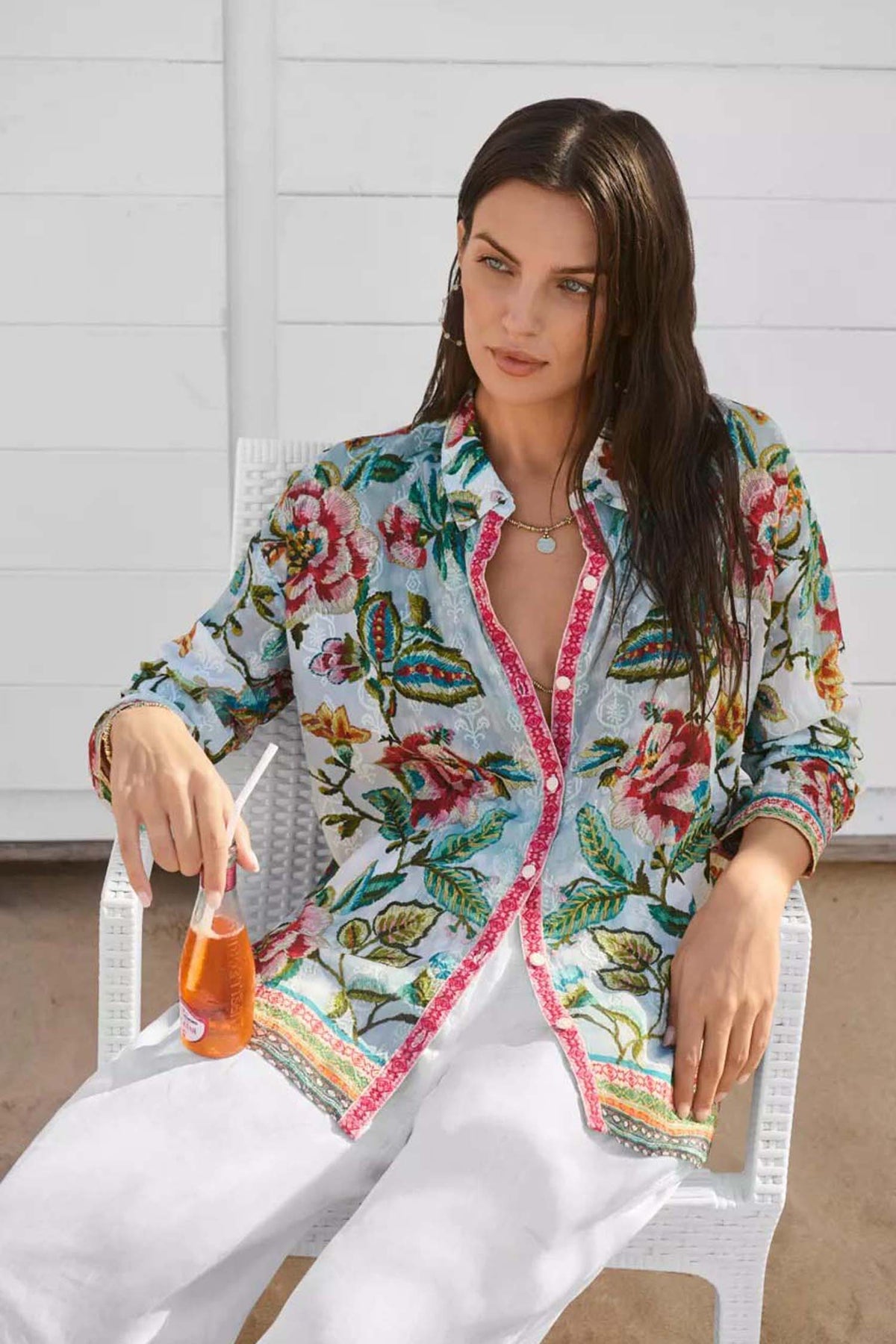 Embellished with a vibrant floral pattern, the Audrey Button Up Shirt in Gillian from Johnny Was is washed in brilliant colour. Designed with a button-front and drop shoulders, this mesmerising shirt is finished with roll-tab sleeves and side slits for a relaxed fit. Pair with palazzo pants and vibrant flats for a polished evening look.