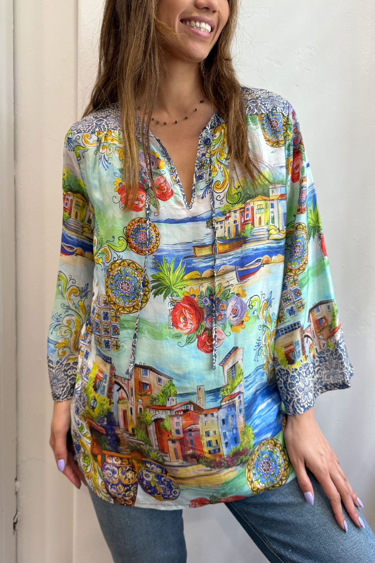 The Christy Lepin Flowy Blouse from Johnny Was is a pullover design that features a tie detail at the neckline, long flared sleeves and side vents for added movement and comfort. The print features a landscape of Mediterranean-style villas and seaside. Put yourself in a sunny state of mind with this blouse.