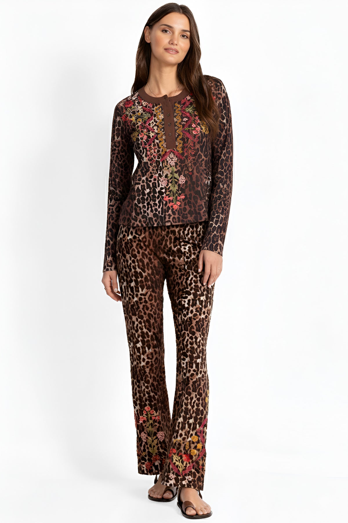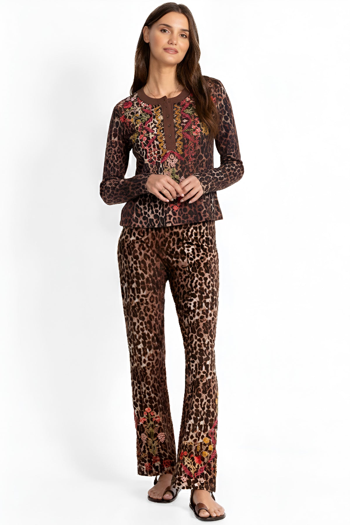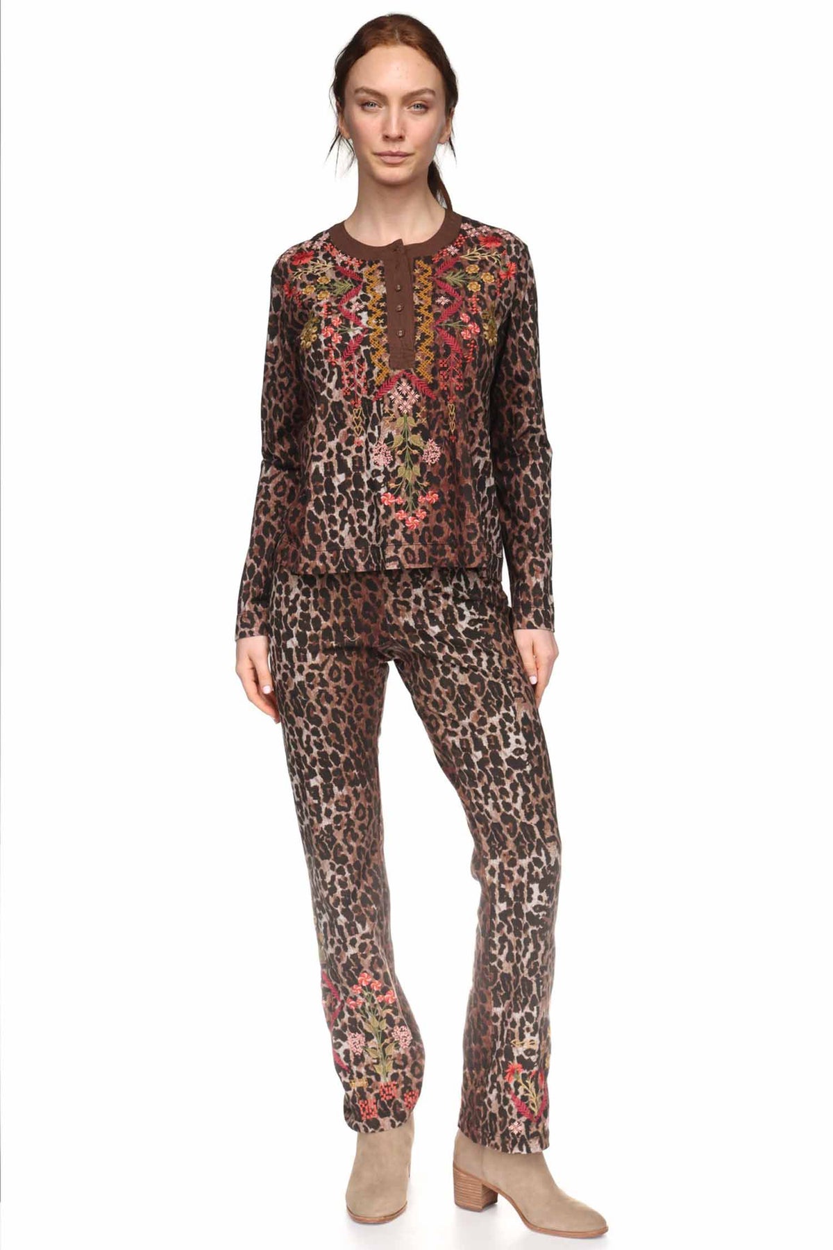 The Malaya Mixed Media Henley T Shirt from Johnny Was is a fresh take on a traditional wardrobe staple. The long-sleeve pullover is crafted from 100% cotton with an allover leopard print and floral embroidery detailing at the top half. It features a Henley button-up neckline and a straight hemline. Pair with the matching leggings or denim for a fresh weekend look.