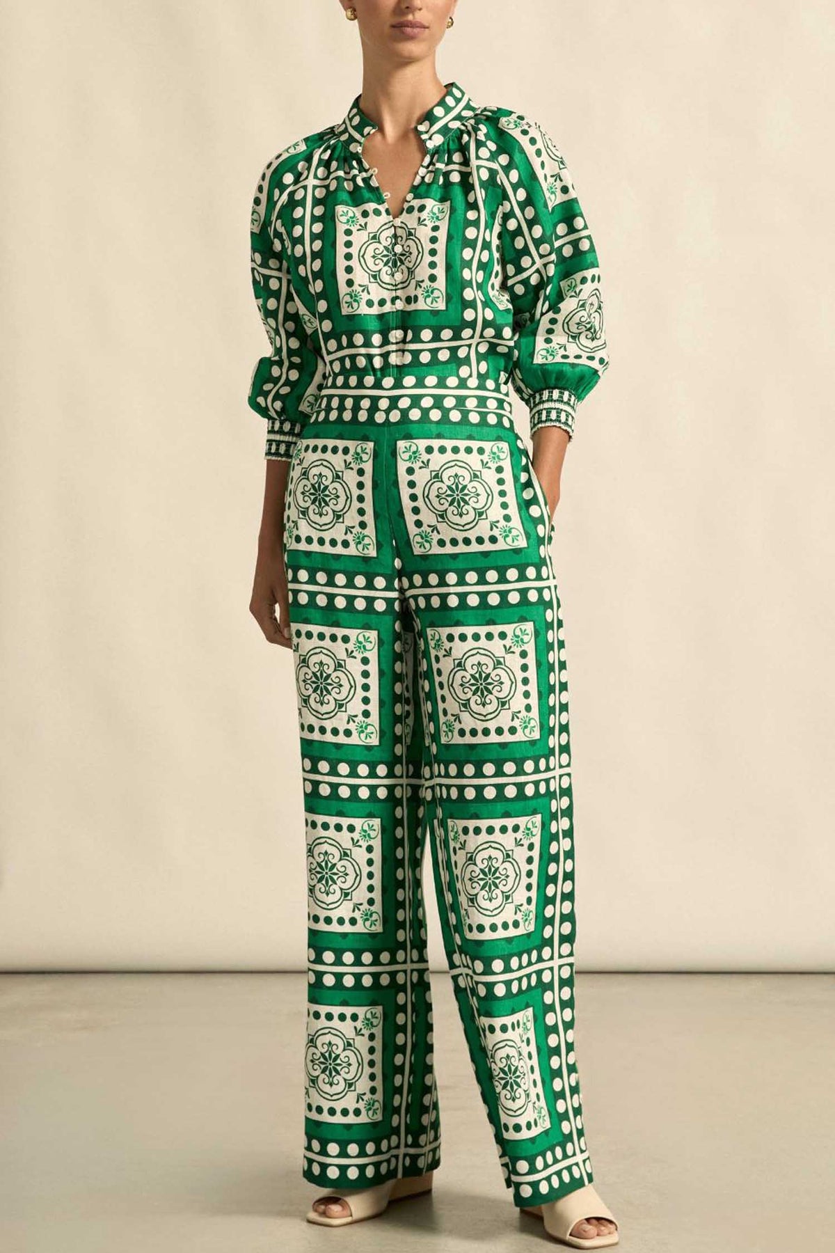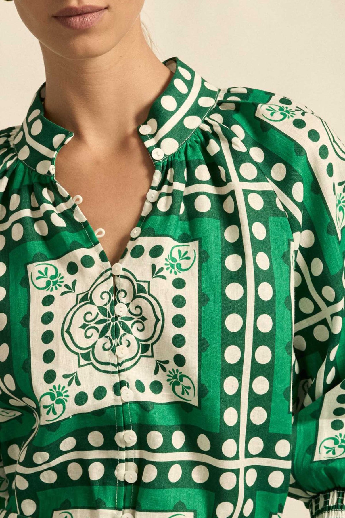 Crafted in linen with considered design details, the Inspire Top from Zoe Kratzmann brings quiet sophistication to trans-seasonal dressing. Sustainably printed in their exclusive parrot scarf print, a spirited exploration of hue and European-inspired graphic motif. It features a high stand collar, button-down front and blouson sleeves with elasticated cuffs. Pair with denim for effortless styling or style with the matching Gesture Pant for a co-ord look.