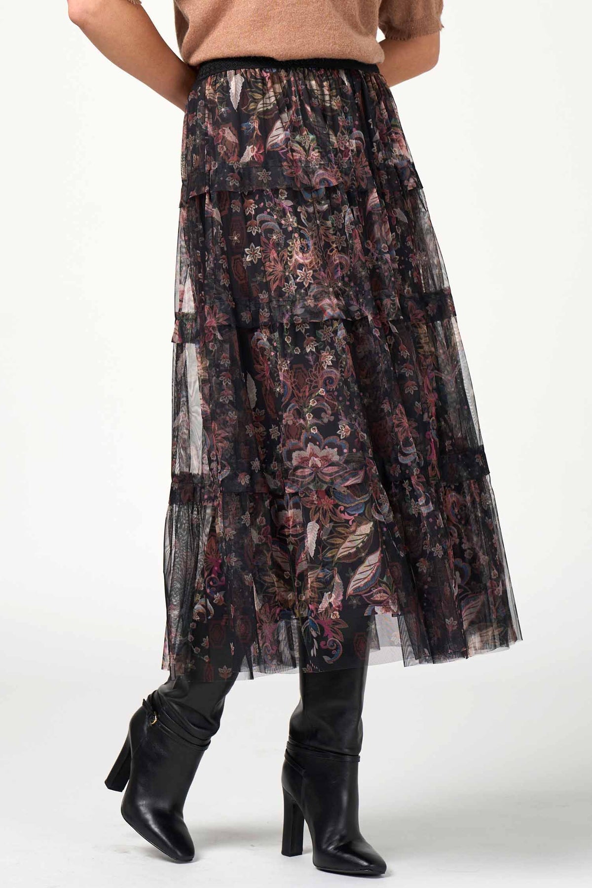 A textured elasticated waistband offers ease and flexibility, while softly tucked tier seams create gentle volume and movement through the skirt. The Black Multi colourway delivers a striking yet wearable finish, making this skirt an elegant choice for both everyday styling and more polished occasions.