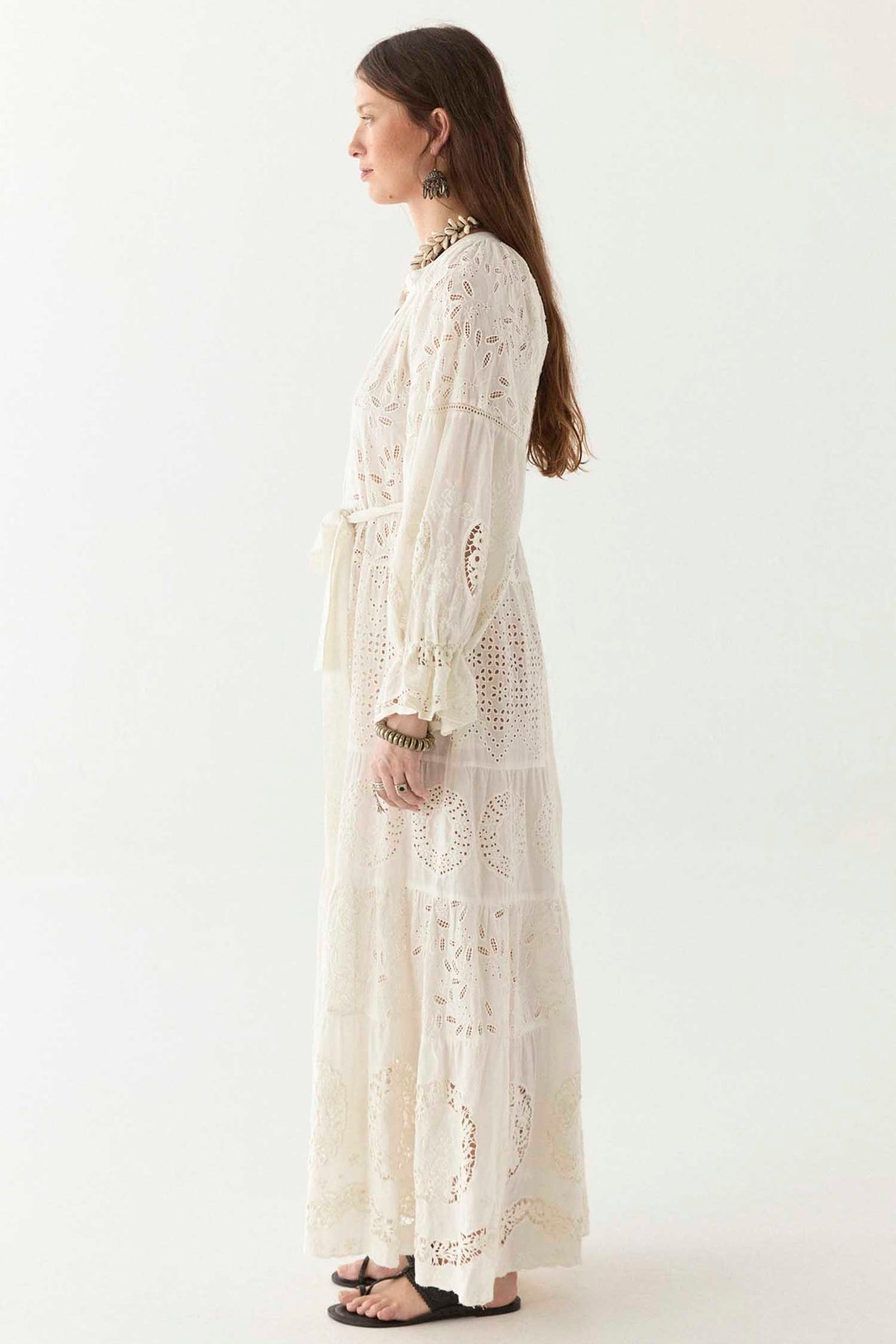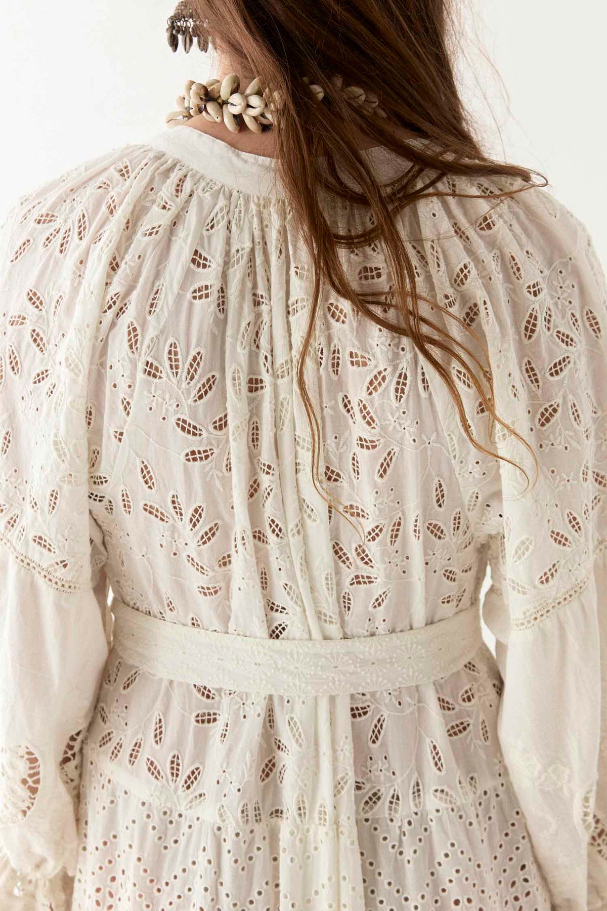The embroidery is carefully placed to highlight the dress’s fluid structure, while the eyelet cut-outs add depth and texture without overwhelming the design. Subtle pin tucks on the bodice and gathered sleeves enhance the soft volume, giving it a natural drape that moves gracefully. A matching belt cinches the waist for a defined yet relaxed silhouette.