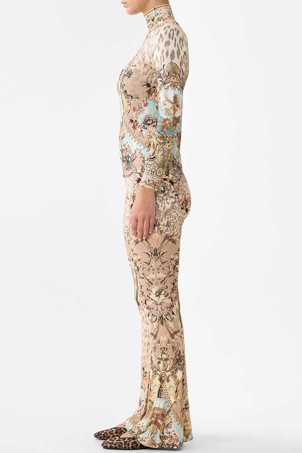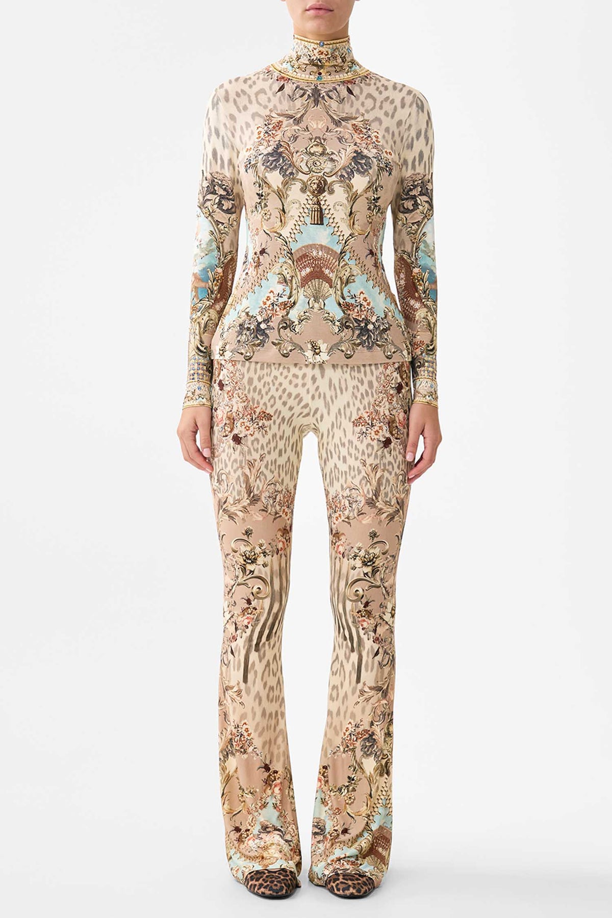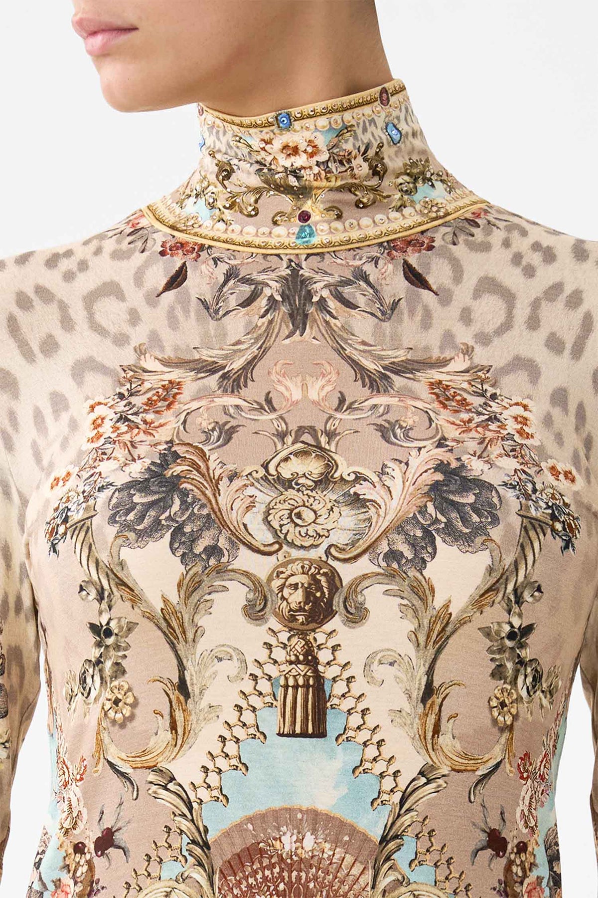 The Jersey Turtleneck in Aranjuez Animalia from Camilla is a handcrafted silhouette designed by their in-house artisans. Created in an exclusive limited edition print, this jersey turtleneck is sculpted by a soft structured neckline and long sleeves. It's finished with intricately placed crystal embellishment.