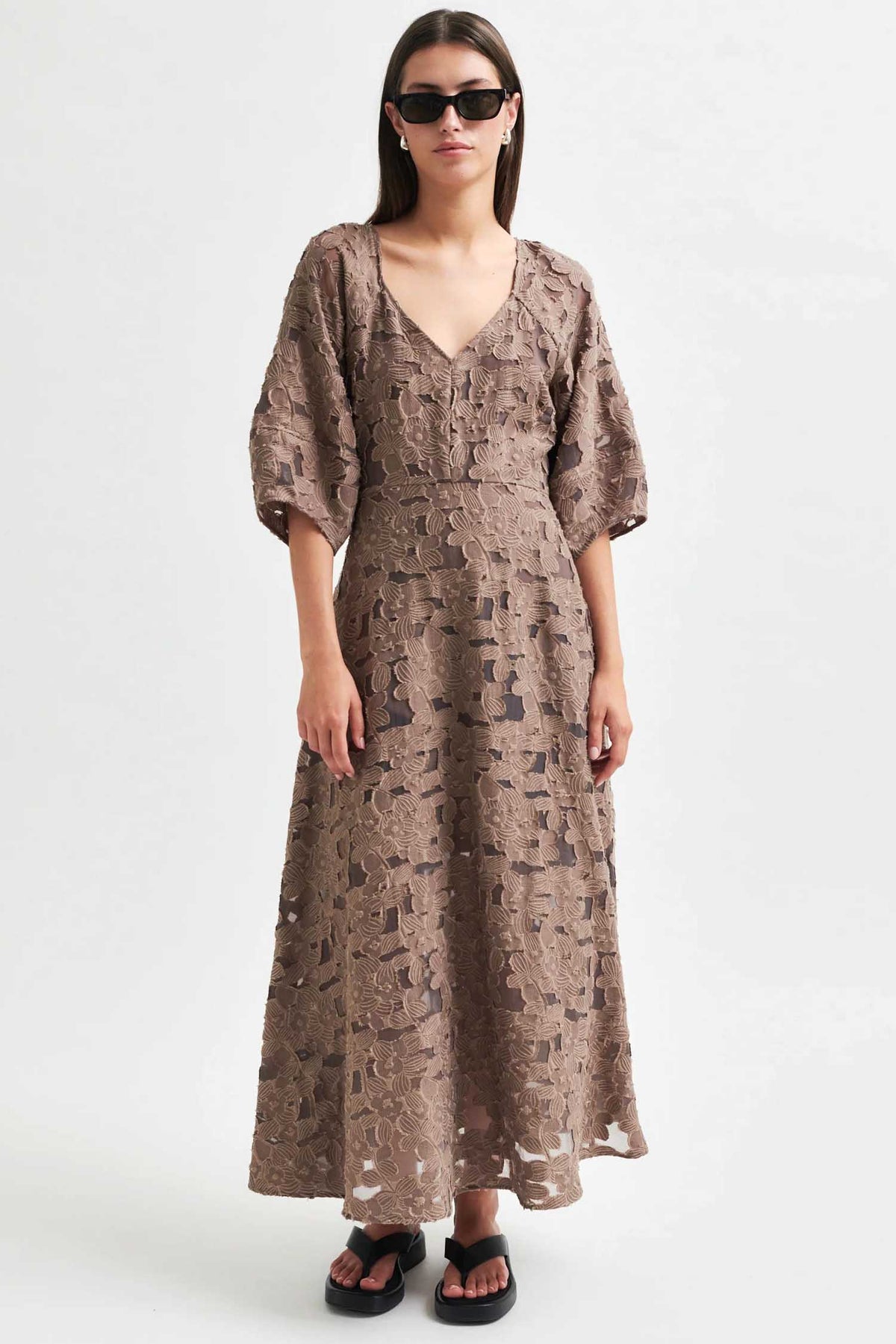 The Agatha Fitted Maxi Dress in Fossil by Second Female.
