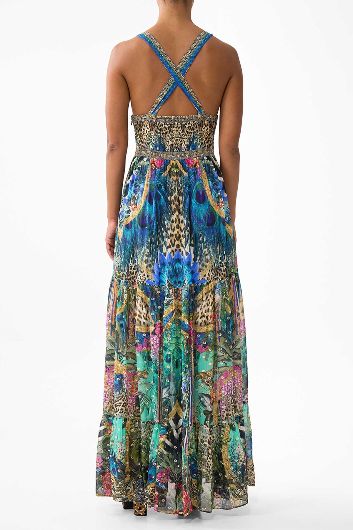 The Bead Strap Gathered Panel Dress in Animal Alchemy from Camilla is a handcrafted silhouette designed by their in house artisans. Reimagined in an exclusive limited edition print, this luxury maxi dress features a plunging neckline that falls into a softly gathered skirt with panels. The straps are adorned with hardware details which meet waist shirring at the back for effortless comfort. It's finished with intricately placed crystal embellishments, for luminous detail.