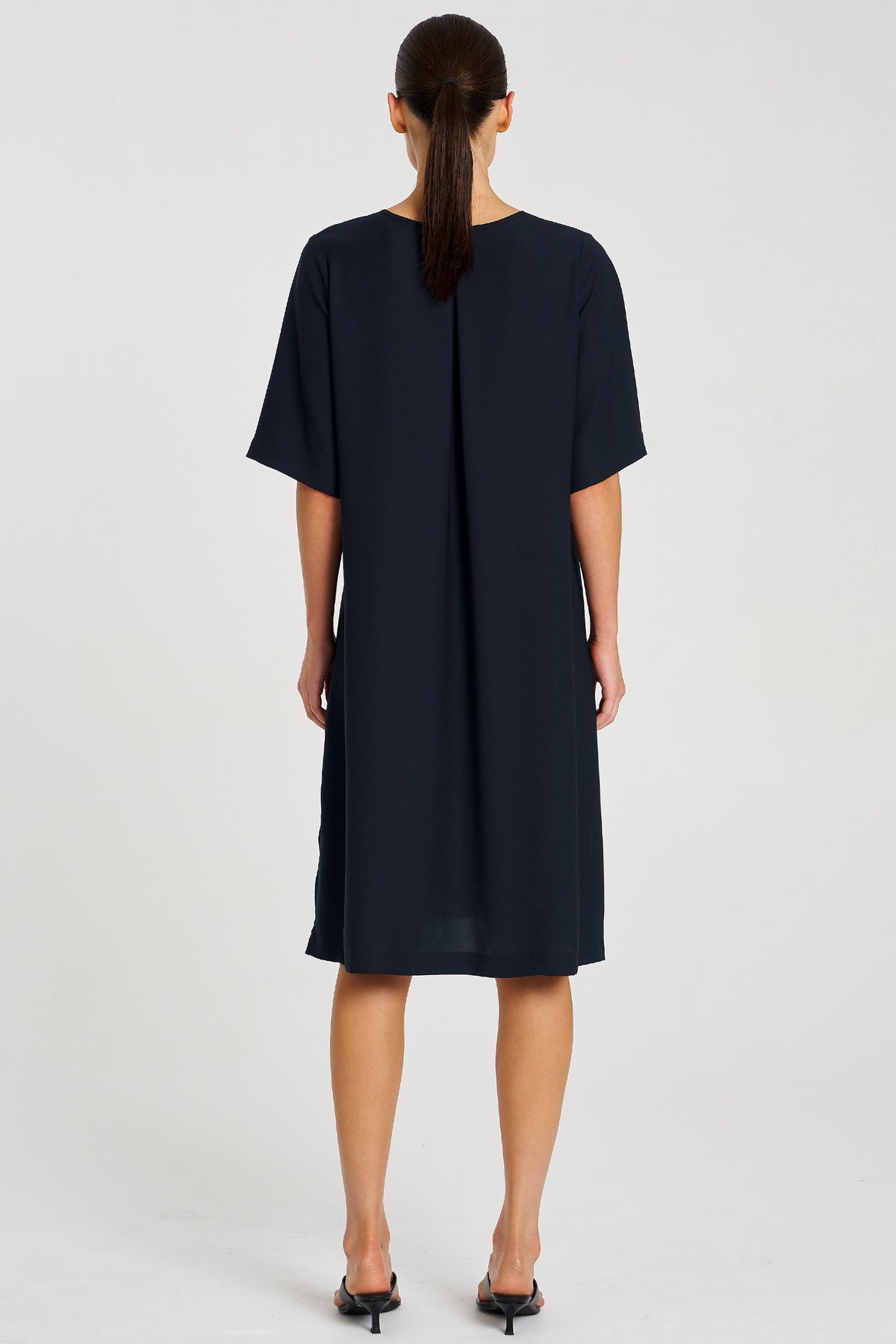 Designed to move with you, the Plaza Dress from Mela Purdie is light, polished, and endlessly versatile. Crafted in Mache, a fabric that feels like heavy silk but is entirely fuss-free. A bound scoop neckline frames the face, while the 3/4 fluid sleeves and centre back pleat create soft shape and elegant ease. From weekday lunches to weekend escapes, this is an effortless wardrobe hero you’ll wear on repeat.