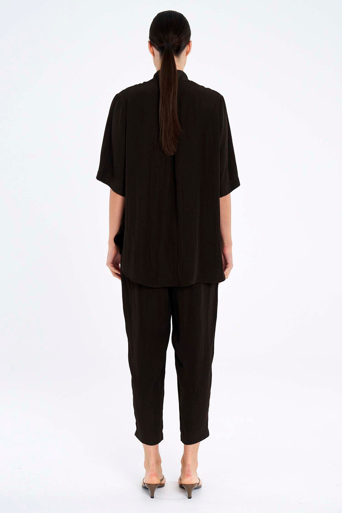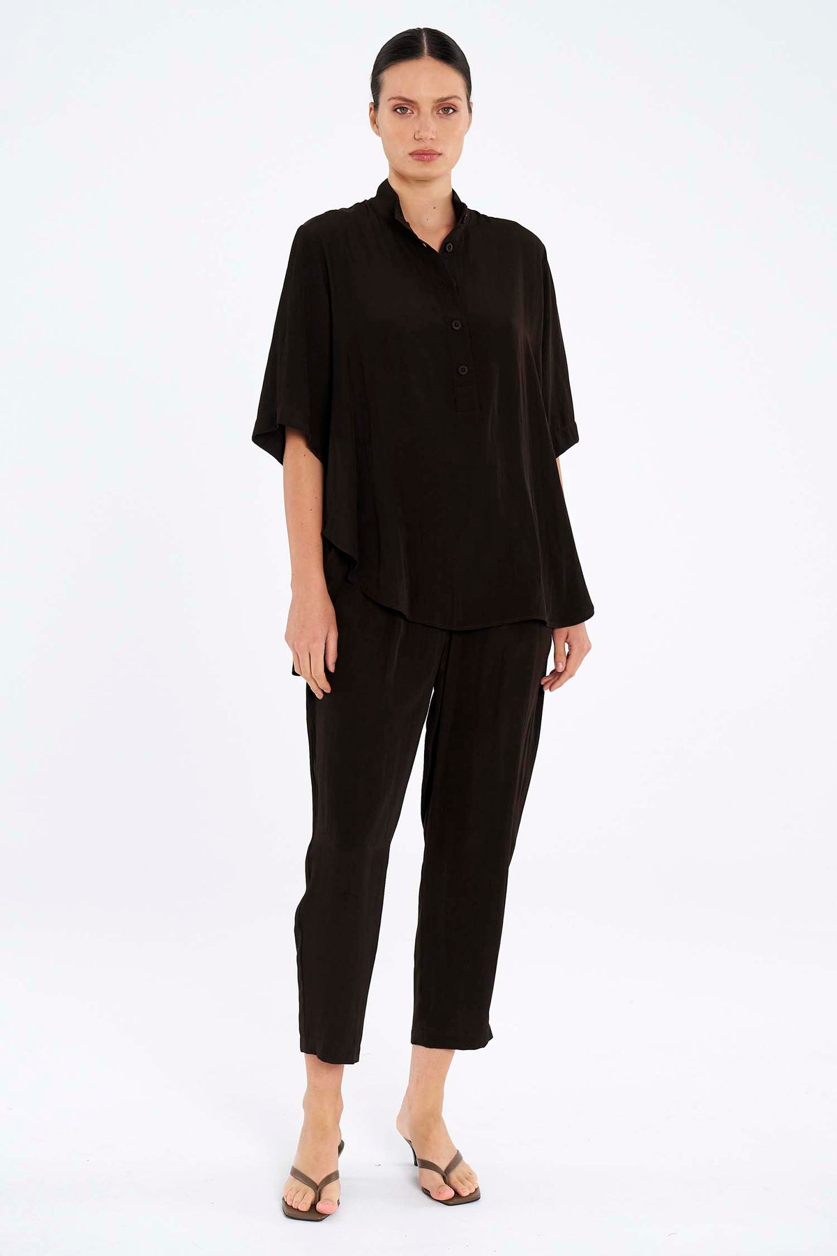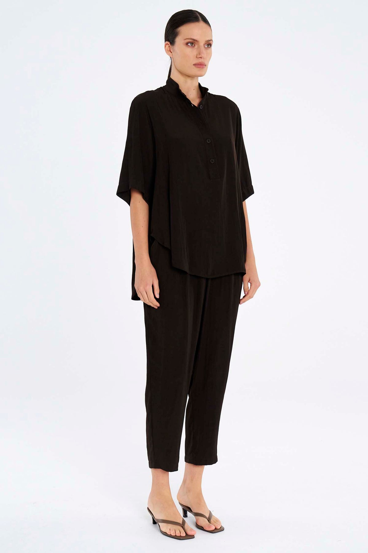 An easy, elegant throw-on that does all the hard work for you. The Swish Tab Plaza is a design you will reach for again and again. Crafted from Mela Purdie's signature Mache fabrication, the Swish Tab Plaza is a longline silhouette designed to move beautifully on the body. Featuring a soft funnel neckline, button-front detail and dramatic curved hem, it delivered relaxed sophistication with endless styling versatility. Fluid, flattering and effortlessly polished, style it with pants when dressing for travel, work or relaxed weekends.