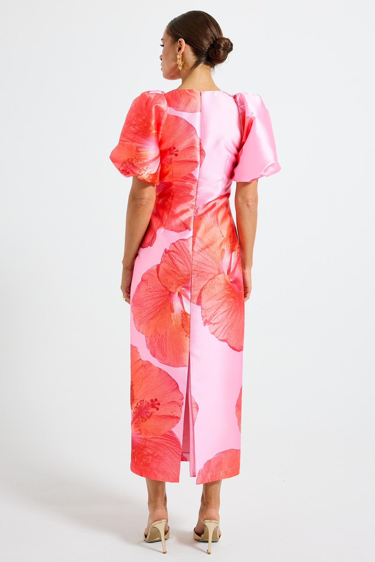 The Kalani Sleeve Midi Dress from Pasduchas is crafted from lustrous taffeta, featuring an exclusive hibiscus print. This form-fitting silhouette skims the body with a high, rounded neckline and fits through the waist and hips before flaring to a midi-length hem. Short, puffed sleeves balance the look, while a centre-back invisible zipper offers ease of fit. Fully lined for comfort and structure.
