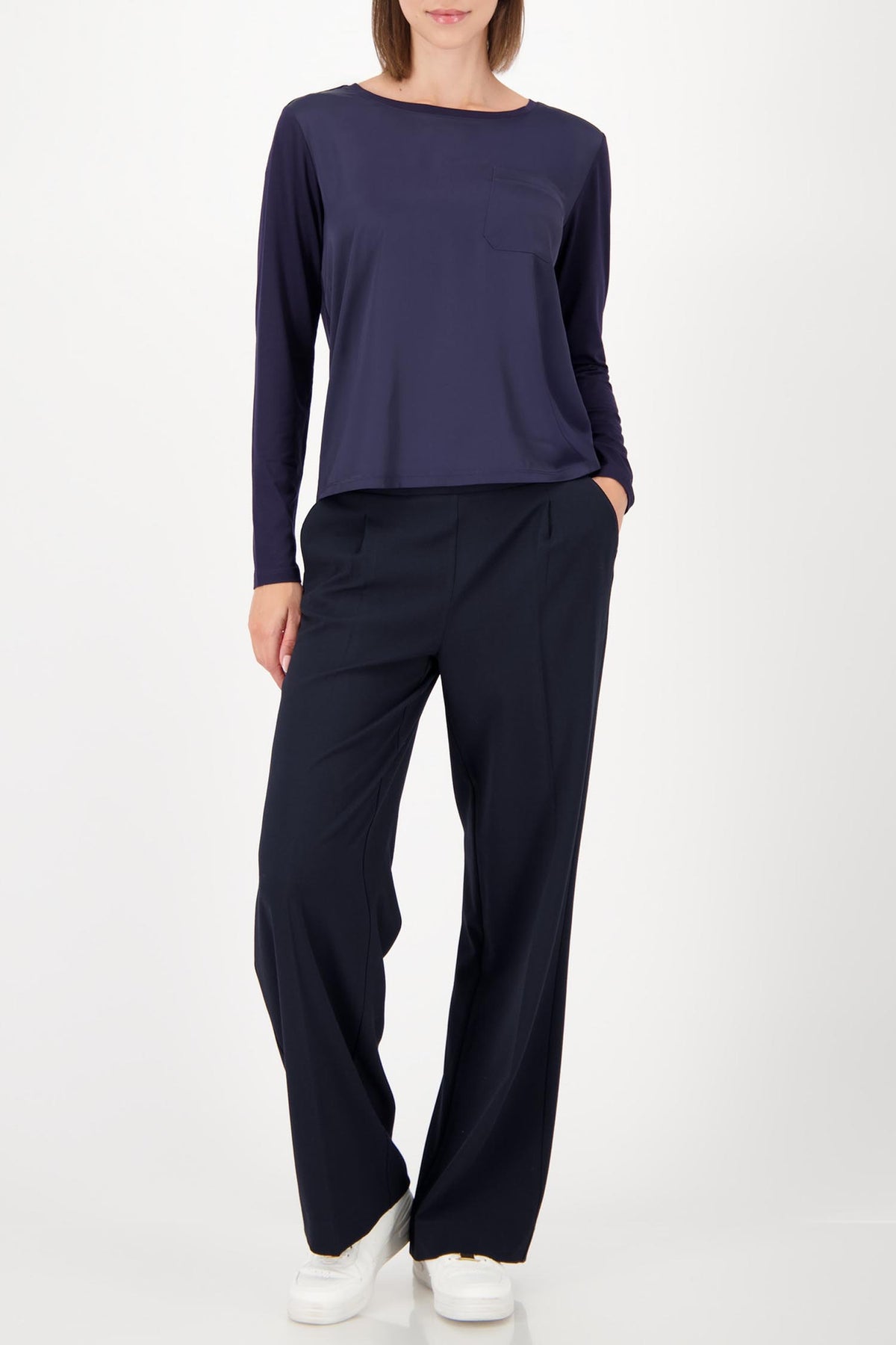The Satin Jersey Top from Monari is crafted from flowing viscose with a refined satin front, creating a beautiful contrast of soft drape and subtle sheen. Designed in a comfortable regular fit, it features a classic patch breast pocket that adds a timeless touch. Effortlessly blending elegance and ease, it’s the perfect choice for stylish everyday looks with a polished yet relaxed feel.