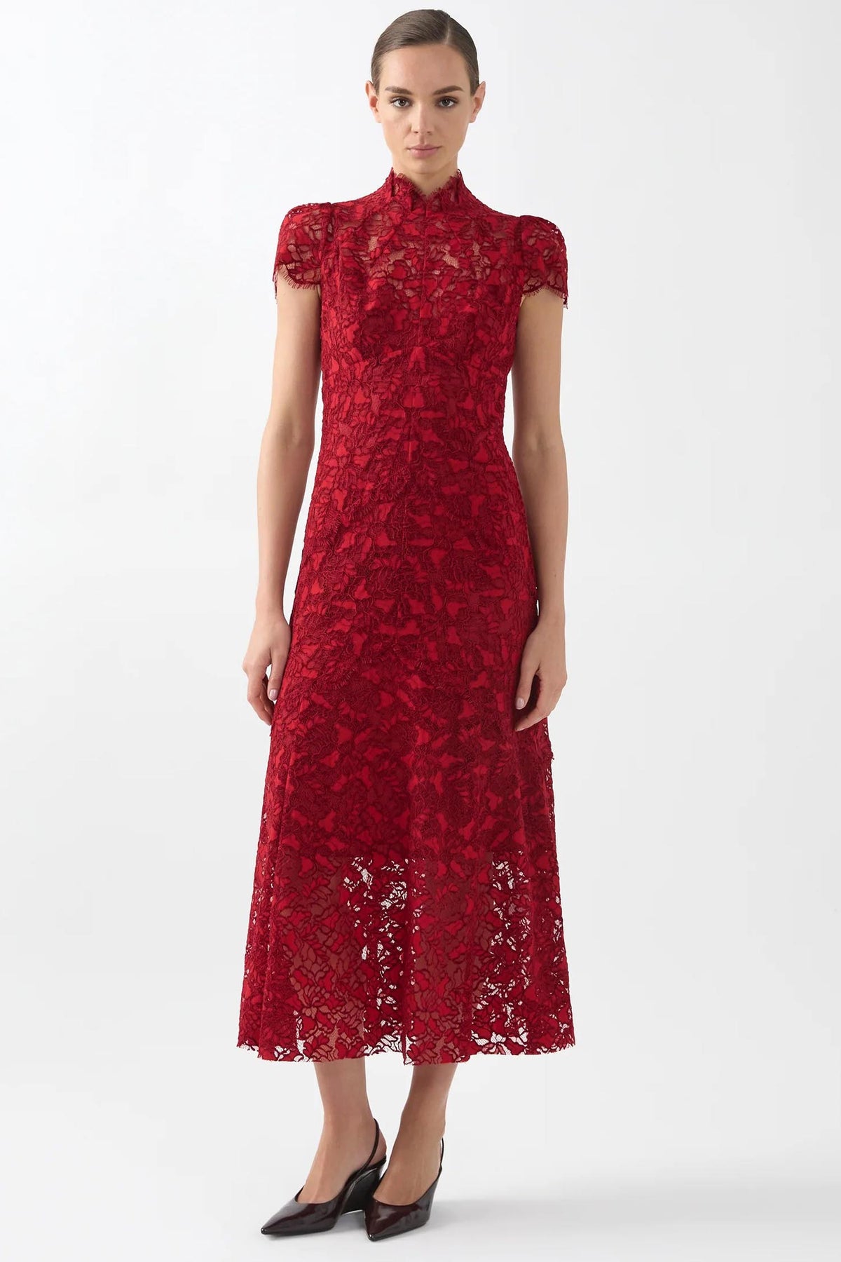 Elegant and timeless, the Carmen Midi Dress from Moss & Spy is crafted from luxurious corded two-tone red velvet lace, offering rich texture and depth. The design features a soft high neckline and delicate cap sleeves, lending a refined, feminine touch.