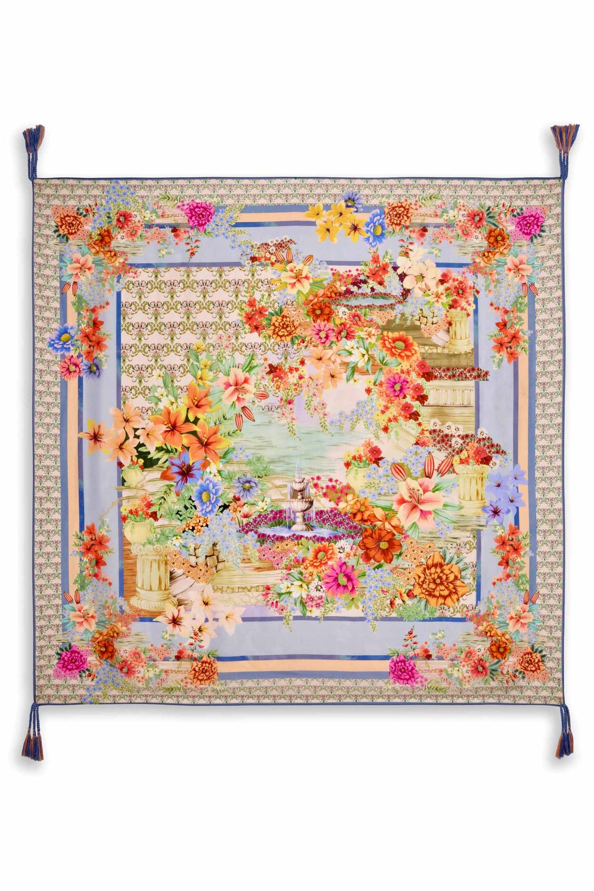 Crafted from 100% sumptuous silk, the Asteria Silk Scarf from Johnny Was adds a splash of colour and hint of elegance to any look. Embellished with a muted floral design against a backdrop of blue hues, this flowing scarf is finished with decorative tassels at the edges. Wear tied loosely at the neck or add to the handle of a posh handbag for a colourful accessory.