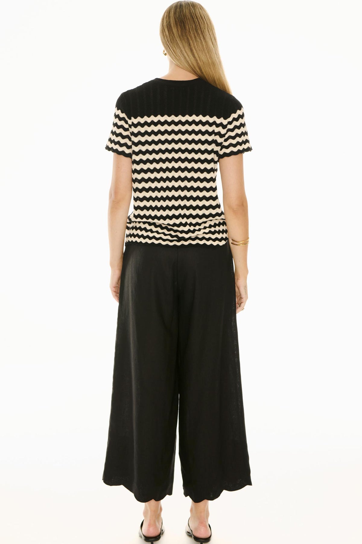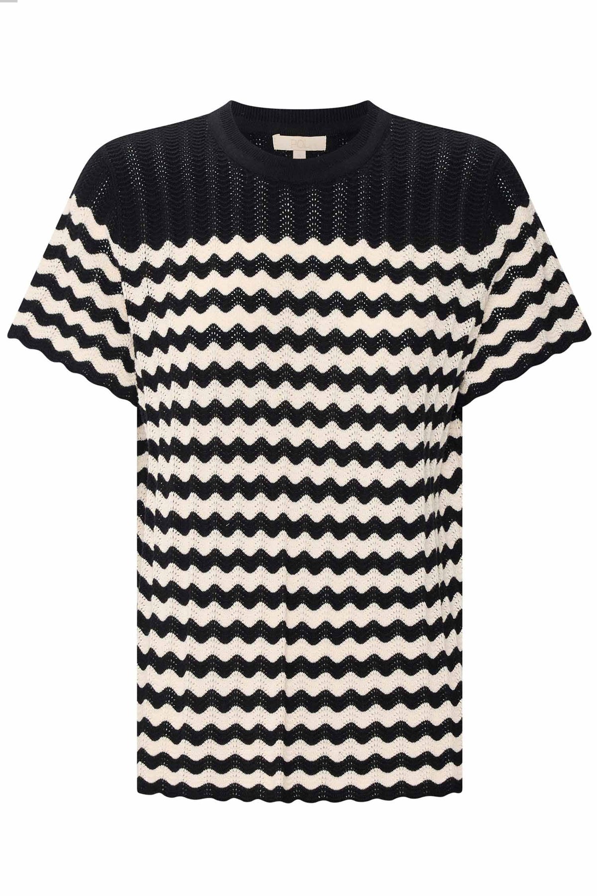 The Bonde Tee Knit from POL proves that basics do not have to be boring. With playful wave pointelle stripe detailing and contrasting panel at the top and bottom, this design strikes the perfect balance between refined and fun. Cut in a relaxed fit that works with everything in your wardrobe. An elevated take on a classic design to take you through the seasons in ease.