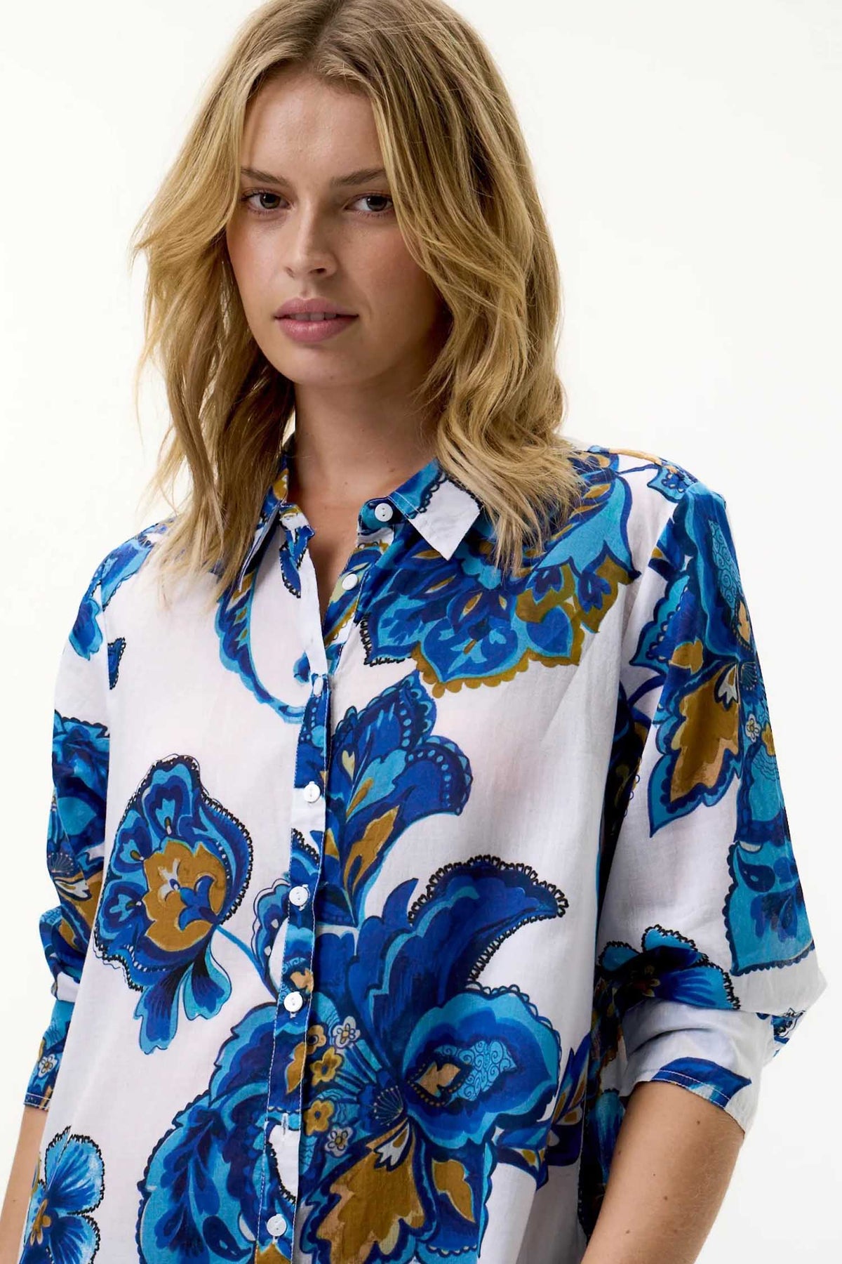 • ¾-length sleeves with button-up cuffs