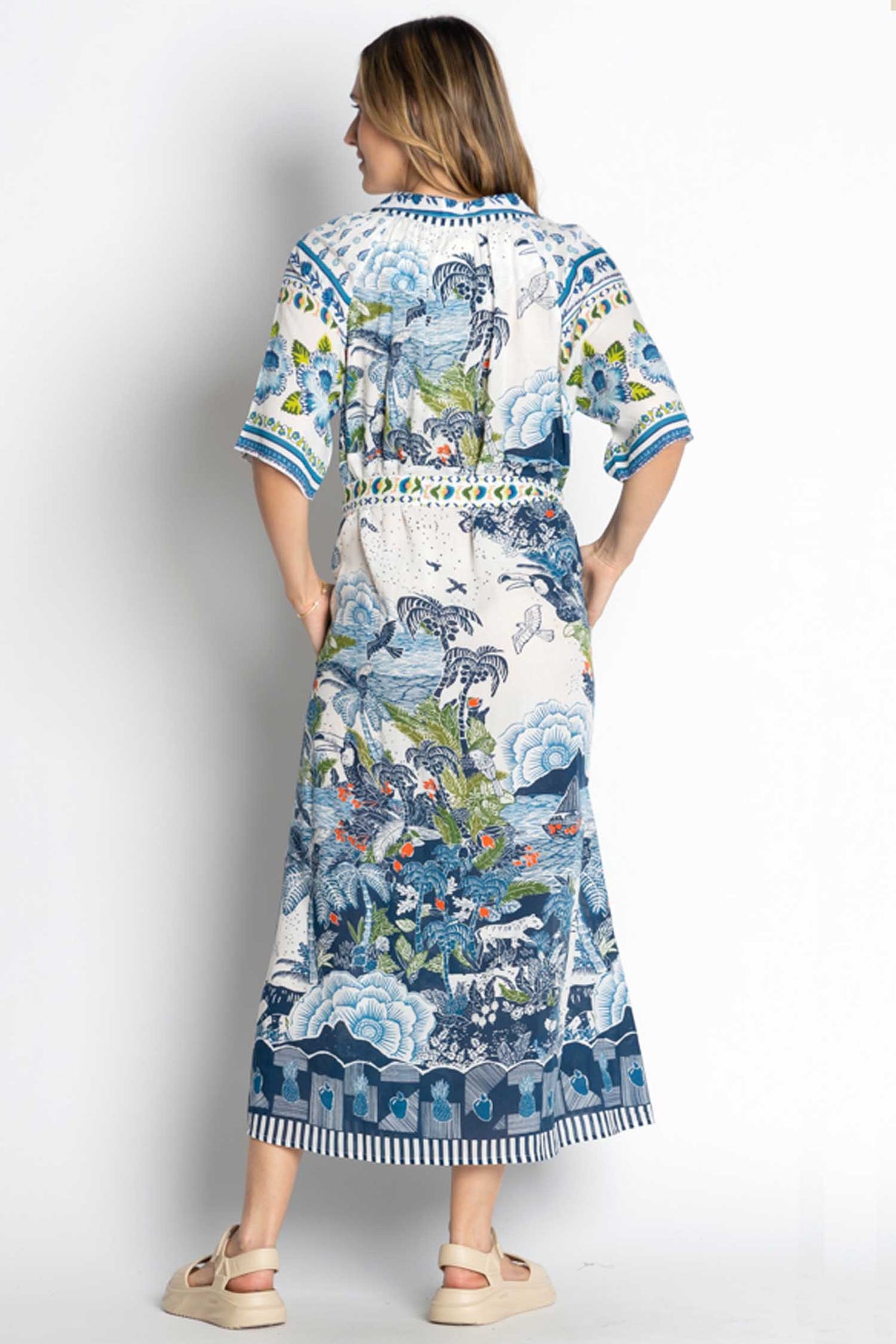 Count on LulaLife to produce such a gorgeous tropical style - the Dita Shirtdress. It has a simple enough design - button through, shirt collar, elbow-length sleeves and pockets. It also features a high waist seam above belt loops before the gentle A-line continues to the hem. Add the optional waist-tie, or not... or even wear it open as a duster over white tank and capris! This style makes a relaxed statement with its fresh tropical print and contrast trim detailing. Accessorise with tan, or white, or blue and you'll complete the laid-back yet striking look.