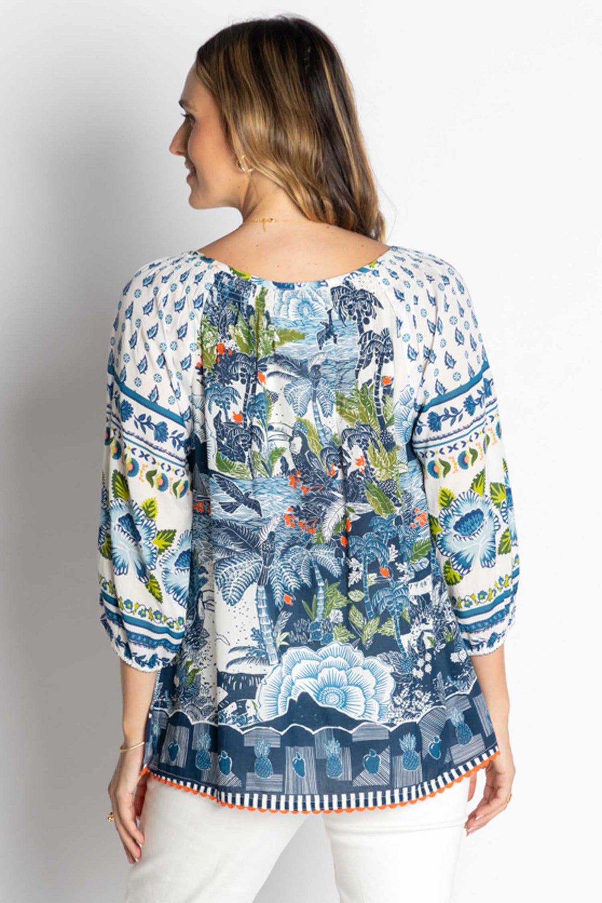 Elevate your everyday style with the LulaLife Dita Top, a vibrant and breezy piece designed for all-day comfort. Crafted from 100% soft viscose, this relaxed-fit top features a flattering scooped neck with ties and a front split, enhanced by delicate shirring and gentle gathers from the neckline. The raglan 3/4 sleeves with elastic hems offer ease of movement, while the contrast border and ricrac trim add a touch of playful detail. Showcasing a stunning digital print, this Australian-designed top pairs effortlessly with jeans, skirts, or shorts for a laid-back yet chic look.